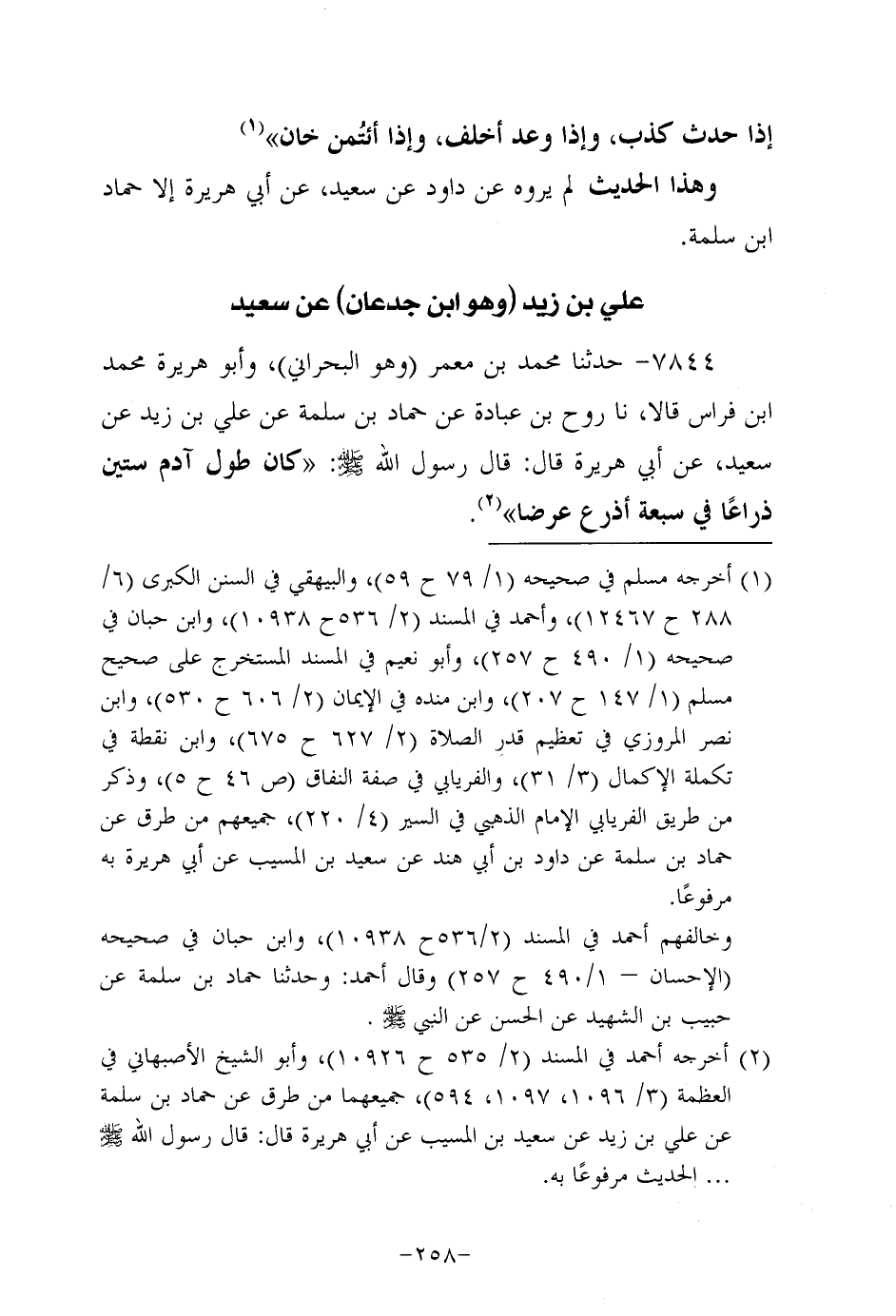 7844- حَدَّثنا مُحَمد بن مَعْمَر، وهُو البحراني، وَأبُو هُرَيرة مُحَمد بن فراس، قَالاَ: حَدَّثنَا روح بن عبادة عن حَمَّادُ بْنُ سَلَمَةَ عَنْ عَلِيِّ بْنِ زَيْدٍ، عَن سَعِيد، عَن أبي هُرَيرة، قَالَ: قَالَ رَسُول اللهِ صَلَّى اللَّهُ عَلَيه وَسَلَّم: كان طول آدم ستين ذراعا في سبعة أذرع عرضا.