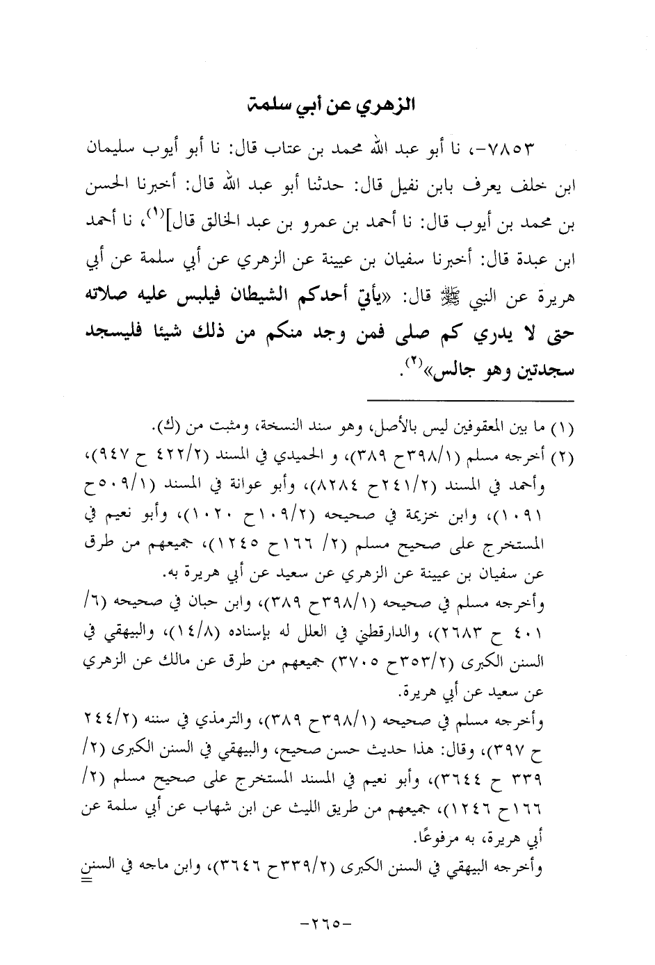 7853- حَدَّثنا أَبُو عَبد الله مُحَمد بن عتاب، قَال: حَدَّثنا أَبُو أيوب سُلَيْمان بن خلف يعرف بابن نفيل، قَال: حَدَّثنا أَبُو عَبد الله، قال: أَخْبَرنا الحسن بن مُحَمد بن أيوب، قَال: حَدَّثنا أَحْمَدُ بْنُ عَمْرو بْنِ عَبد الْخَالِقِ، قَال: حَدَّثنا أَحْمَدُ بْنُ عَبْدَةَ، قال: أَخْبَرنا سفيان بن عُيَينة، عَن الزُّهْرِيّ، عَن أَبِي سَلَمَة، عَن أَبِي هُرَيرة، عَن النَّبِيّ صَلَّى اللَّهُ عَلَيه وَسَلَّم قال: يأتي أحدكم الشيطان فيلبس عليه صلاته حتى لا يدري كم صلى فمن وجد منكم من ذلك شيئا فليسجد سجدتين، وهُو جالس.