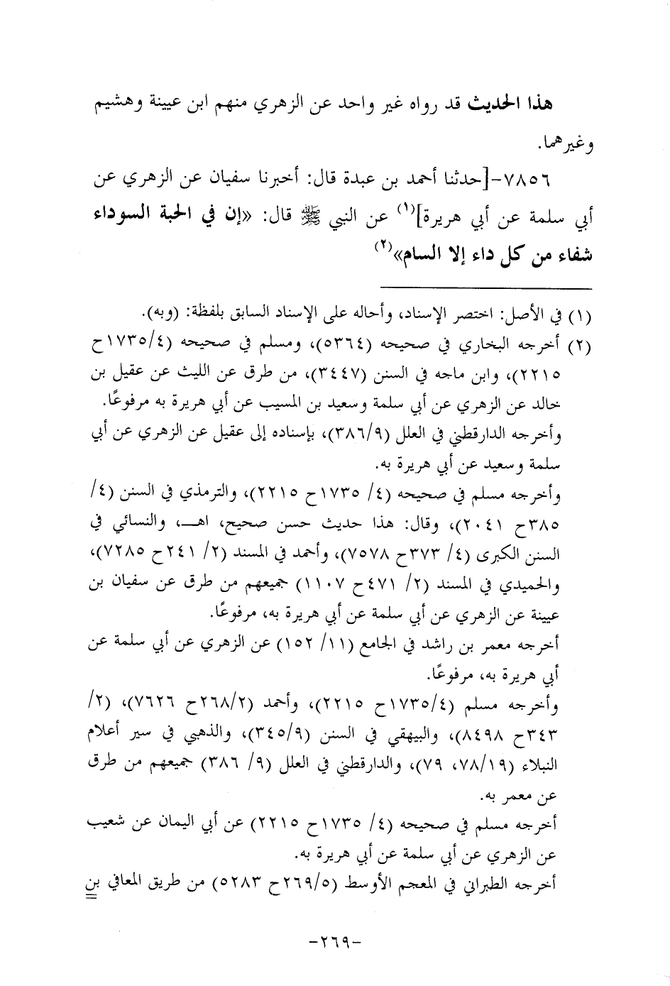 7856- حَدَّثنا أَحْمَدُ بْنُ عَبْدَةَ، قال: أَخْبَرنا سُفيان، عَن الزُّهْرِيّ، عَن أَبِي سَلَمَة، عَن أَبِي هُرَيرة، عَن النَّبِيّ صَلَّى اللَّهُ عَلَيه وَسَلَّم قال: إن في الْحَبَّةَ السَّوْدَاءَ شِفَاءٌ مِنْ كُلِّ دَاءٍ إلاَّ السام.