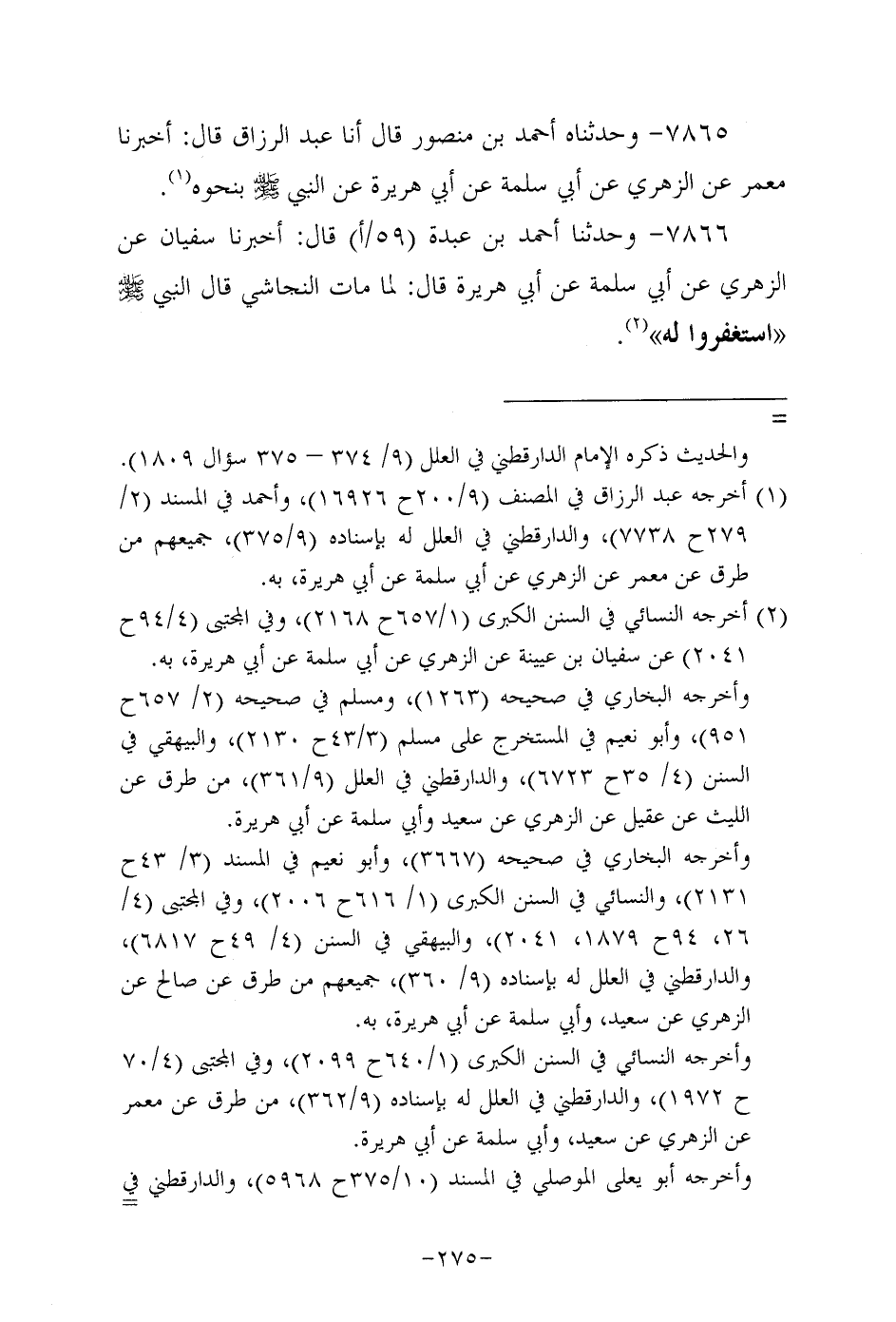 7866- وحَدَّثنا أَحْمَدُ بْنُ عَبْدَةَ، قال: أَخْبَرنا سُفيان، عَن الزُّهْرِيّ، عَن أَبِي سَلَمَة، عَن أَبِي هُرَيرة، قال: لما مات النجاشي قال النَّبِيّ صَلَّى الله عَلَيه وَسَلَّم استغفروا له.