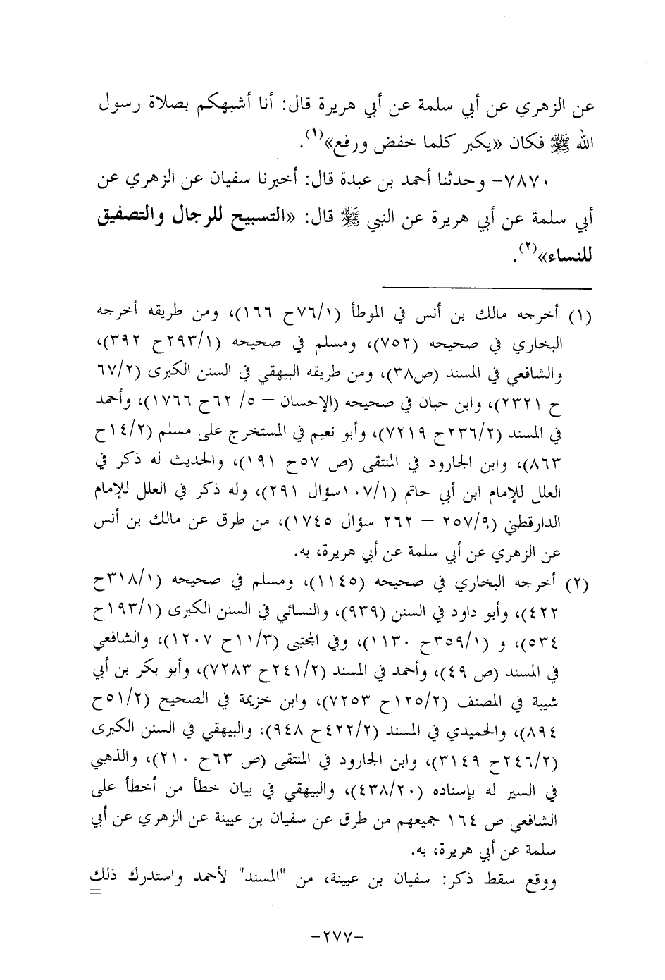 7870- وحَدَّثنا أَحْمَدُ بْنُ عَبْدَةَ، قال: أَخْبَرنا سُفيان، عَن الزُّهْرِيّ، عَن أَبِي سَلَمَة، عَن أَبِي هُرَيرة، عَن النَّبِيّ صَلَّى اللَّهُ عَلَيه وَسَلَّم قال: التسبيح للرجال والتصفيق للنساء.