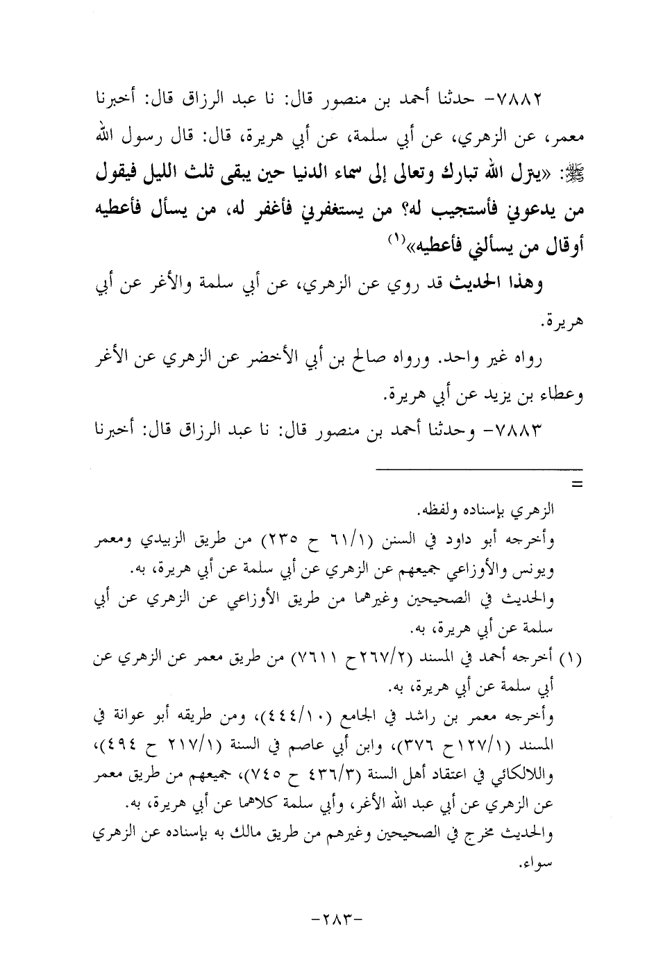 7882- حَدَّثنا أحمد بن منصور، قَال: حَدَّثنا عَبد الرزاق، قال: أَخْبَرنا مَعْمَر، عَن الزُّهْرِيّ، عَن أَبِي سَلَمَة، عَن أَبِي هُرَيرة، قَالَ: قَالَ رَسُول اللهِ صَلَّى اللَّهُ عَلَيه وَسَلَّم: ينزل الله تبارك وتعالى إلى سماء الدنيا حين يبقى ثلث الليل فيقول من يدعوني فأستجيب له؟ من يستغفرني فأغفر له من يسأل فأعطيه، أو قال من يسألني فأعطيه.