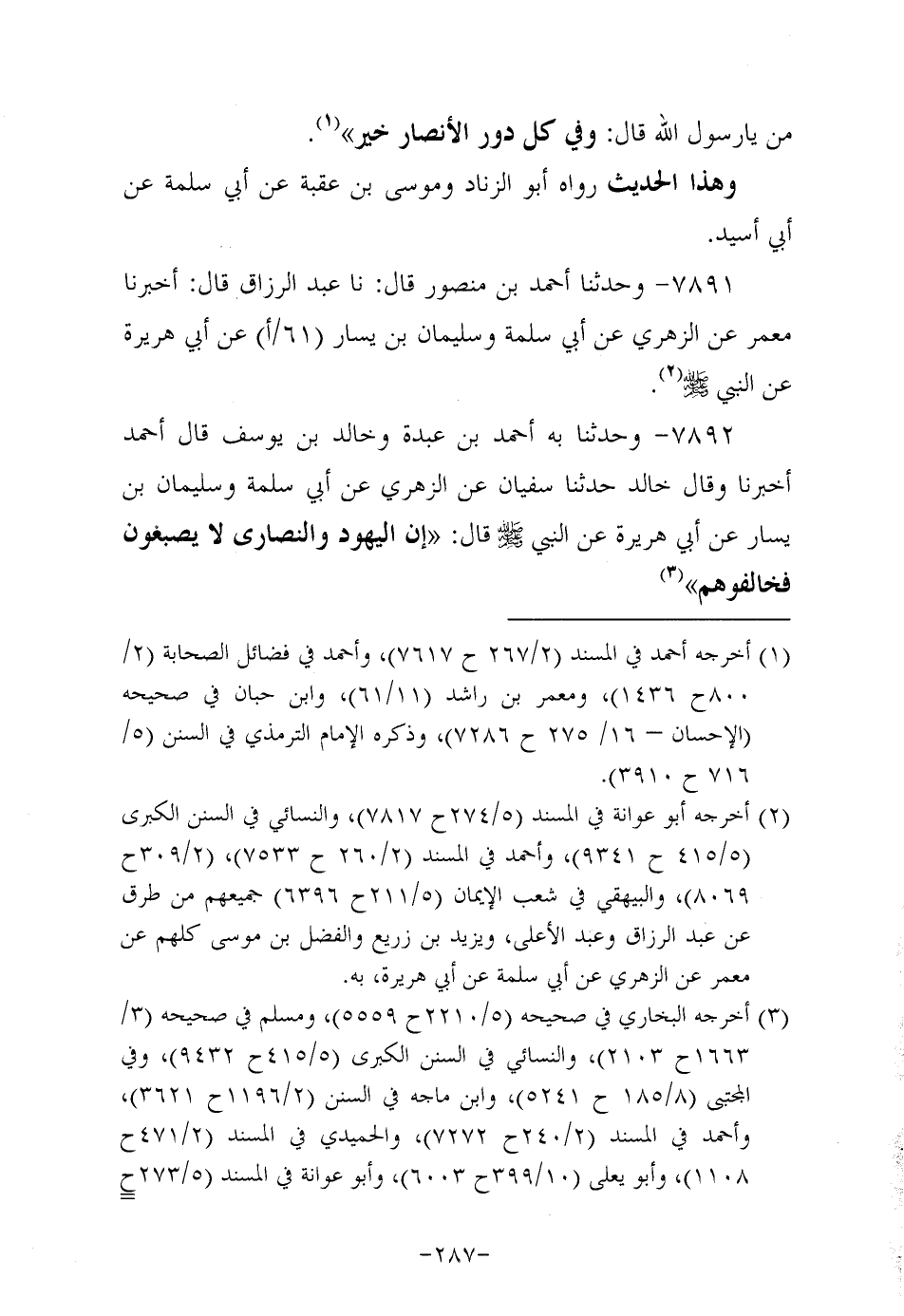 7892- وحَدَّثنا به أحمد بن عَبدة، وَخالد بن يوسف، قال أحمد: أخبرنا، وَقال خالد حَدَّثنا سُفيان، عَن الزُّهْرِيّ، عَن أبي سَلَمَة وسليمان بن يسار، عَن أَبِي هُرَيرة، عَن النَّبِيّ صَلَّى اللَّهُ عَلَيه وَسَلَّم قال: إن اليهود والنصارى لا يصبغون فخالفوهم.