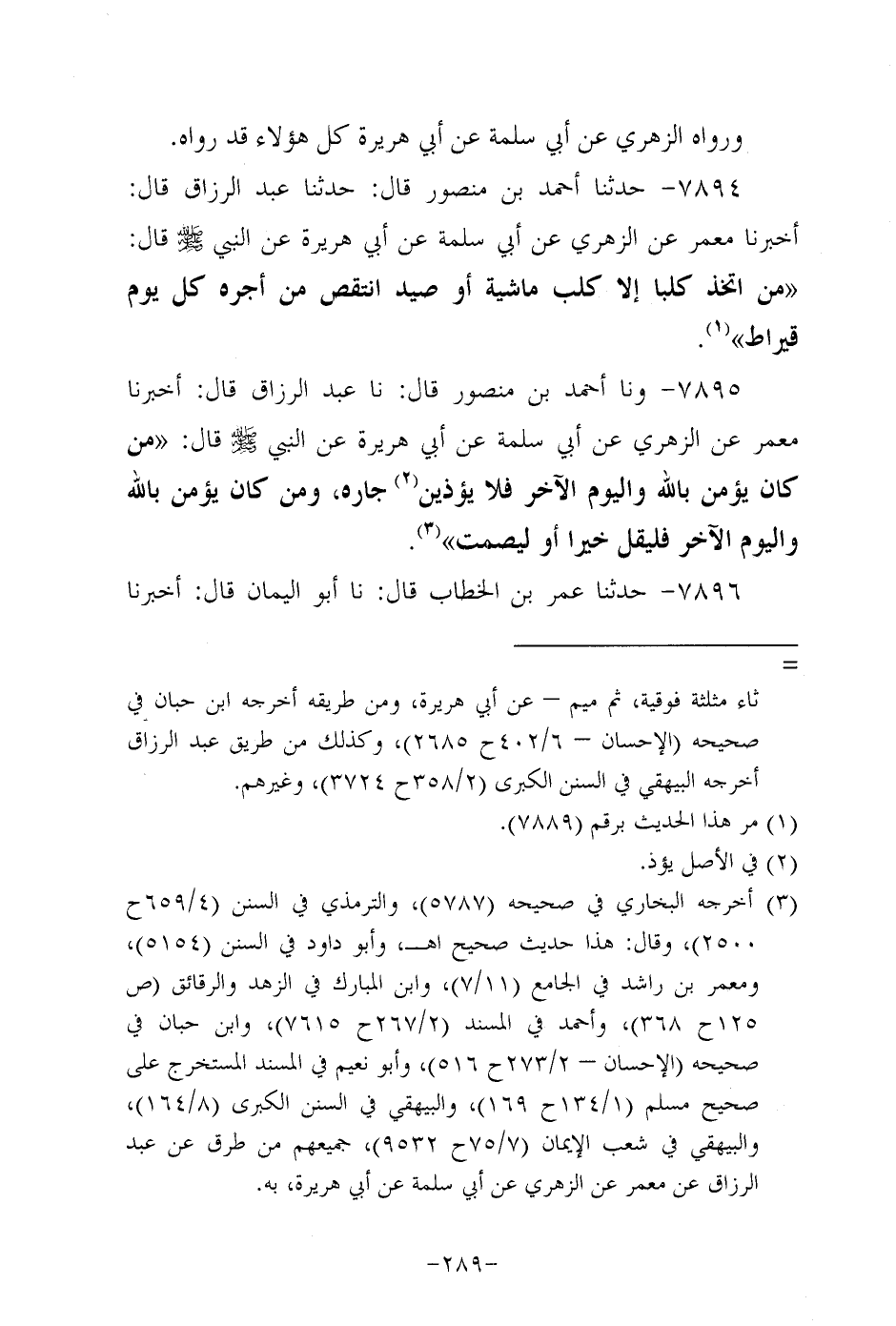 7895- وحَدَّثنا أحمد بن منصور، قَال: حَدَّثنا عَبد الرزاق، قال: أَخْبَرنا مَعْمَر، عَن الزُّهْرِيّ، عَن أَبِي سَلَمَة، عَن أَبِي هُرَيرة، عَن النَّبِيّ صَلَّى اللَّهُ عَلَيه وَسَلَّم قَالَ: مَنْ كَانَ يُؤْمِنُ بِاللَّهِ وَالْيَوْمِ الآخِرِ فلا يؤذين جاره وَمَنْ كَانَ يُؤْمِنُ بِاللَّهِ وَالْيَوْمِ الآخِرِ فَلْيَقُلْ خيرا، أو ليصمت.