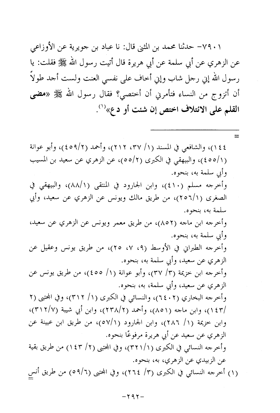 7901- حَدَّثَنا مُحَمَّدُ بْنُ الْمُثَنَّى، قَال: حَدَّثنا عباد بن جويرية، عَن الأَوْزاعِيّ، عَن الزُّهْرِيّ، عَن أَبِي سَلَمَة، عَن أَبِي هُرَيرة، قال أتيت رَسُولِ اللَّهِ صَلَّى اللَّهُ عَلَيه وَسَلَّم فَقُلْتُ: يا رَسولَ اللهِ إني رجل شاب وإني أخاف على نفسي العنت ولست أجد طولا أن أتزوج من النساء فتأمرني أن أختصي؟ فَقَالَ رَسُولُ اللَّهِ صَلَّى اللَّهُ عَلَيه وَسَلَّم: مضى القلم على الائتلاف اختص إن شئت، أو دع.