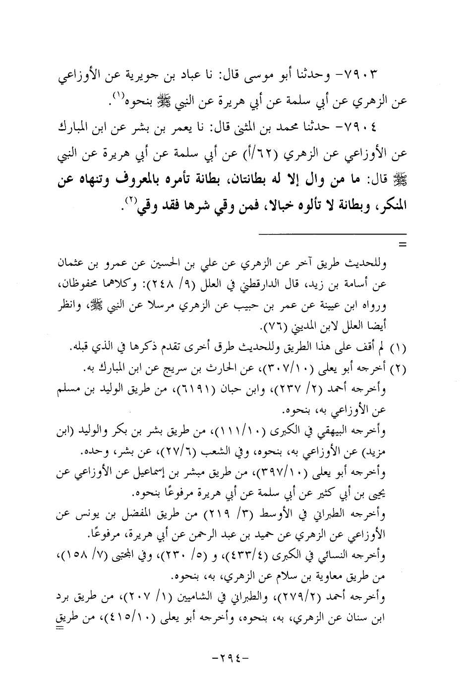 7904- حَدَّثَنا مُحَمَّدُ بْنُ الْمُثَنَّى، قَال: حَدَّثنا يعمر بن بشر، عَن ابن المبارك، عَن الأَوْزاعِيّ، عَن الزُّهْرِيّ، عَن أَبِي سَلَمَة، عَن أَبِي هُرَيرة، عَن النَّبِيّ صَلَّى اللَّهُ عَلَيه وَسَلَّم قال: ما من وال إلاَّ له بطانتان بطانة تأمره بالمعروف وتنهاه عن المنكر وبطانة لا تألوه خبالا فمن وقى شرها فقد وقى.