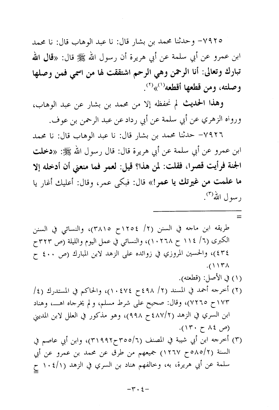7925- وحَدَّثنا مُحَمد بن بَشَّار، قَال: حَدَّثنا عَبد الوهاب، قَال: حَدَّثنا مُحَمد بن عَمْرو، عَن أبي سَلَمَة، عَن أبي هُرَيرة؛ أَنَّ رَسُولَ اللهِ صَلَّى اللَّهُ عَلَيه وَسَلَّم قال: قال الله تبارك وتعالى: أنا الرحمن وهي الرحم اشتققت لها من اسمي فمن وصلها وصلته، وَمَنْ قطعها أقطعه.