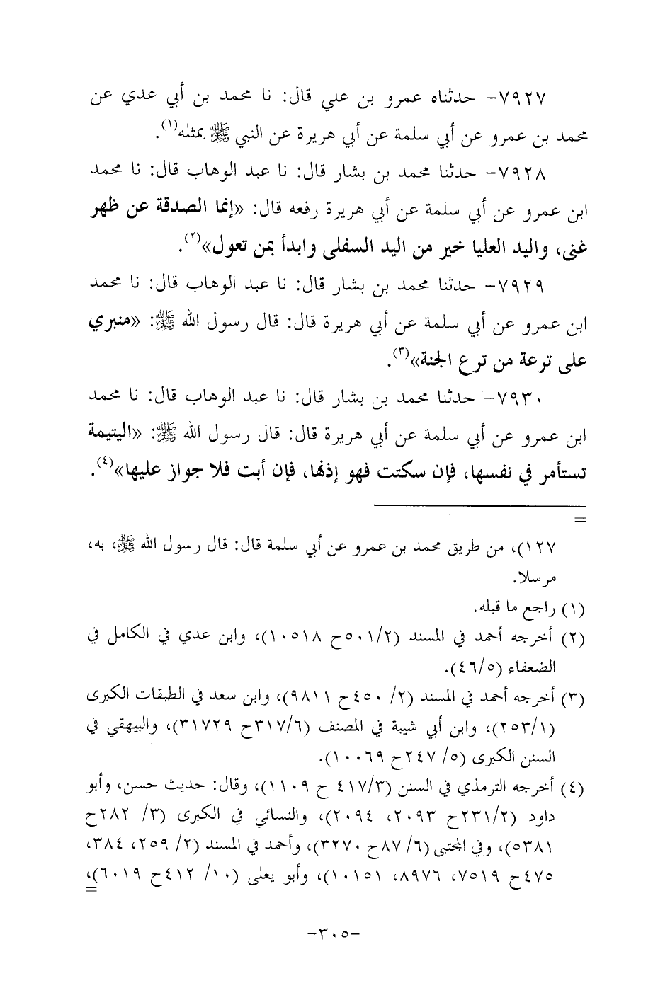 7928- حَدَّثنا مُحَمد بن بَشَّار، قَال: حَدَّثنا عَبد الوهاب، قَال: حَدَّثنا مُحَمد بن عَمْرو، عَن أبي سَلَمَة، عَن أبي هُرَيرة رفعه قال: إنما الصدقة عن ظهر غنى واليد العليا خير من اليد السفلى وابدأ بمن تعول.