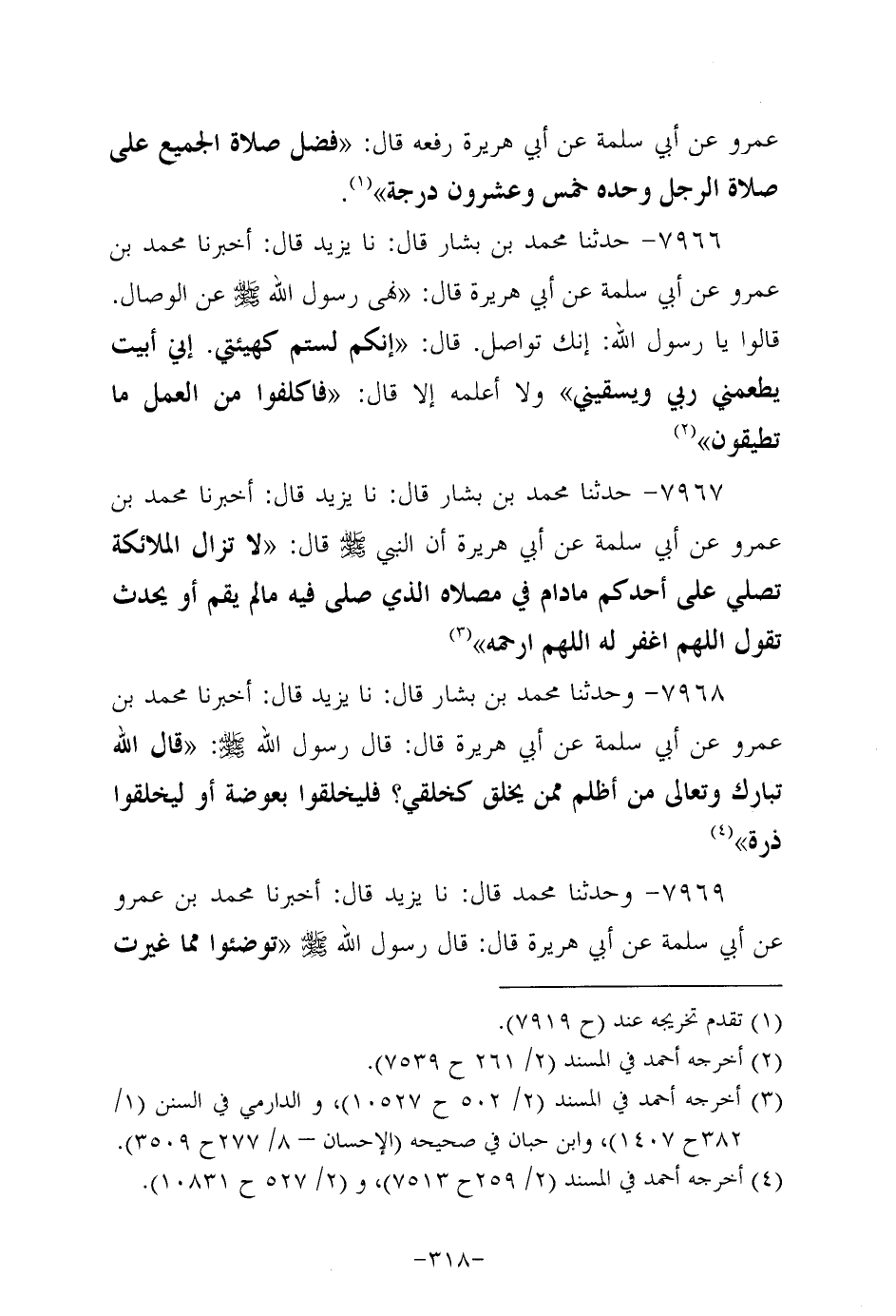 7966- حَدَّثنا مُحَمد بن بَشَّار، قَال: حَدَّثنا يزيد، قال: أَخْبَرنا مُحَمد بن عَمْرو، عَن أبي سَلَمَة، عَن أبي هُرَيرة، قَالَ: نَهَى رَسُولُ اللهِ صَلَّى اللَّهُ عَلَيه وَسَلَّم عن الوصال. قالوا يا رَسولَ اللهِ: إنك تواصل قال: إنكم لستم كهيئتي إني أبيت يطعمني ربي ويسقيني، ولاَ أعلمه إلاَّ قال: فاكلفوا من العمل ما تطيقون.