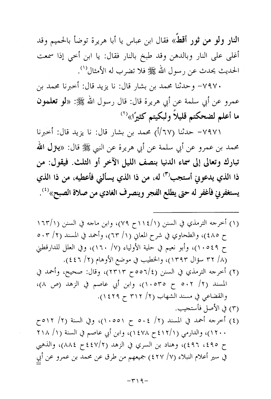 7971- حَدَّثنا مُحَمد بن بَشَّار، قَال: حَدَّثنا يزيد، قال: أَخْبَرنا مُحَمد بن عَمْرو، عَن أبي سَلَمَة، عَن أَبِي هُرَيرة، عَن النَّبِيّ صَلَّى اللَّهُ عَلَيه وَسَلَّم قال: ينزل الله تبارك وتعالى إلى سماء الدنيا بنصف الليل الآخر، أو الثلث. فيقول: من ذا الذي يدعوني أستجب له من ذا الذي يسألني فأعطيه من ذا الذي يستغفرني فأغفر له حتى يطلع الفجر وينصرف الغادي من صلاة الصبح.