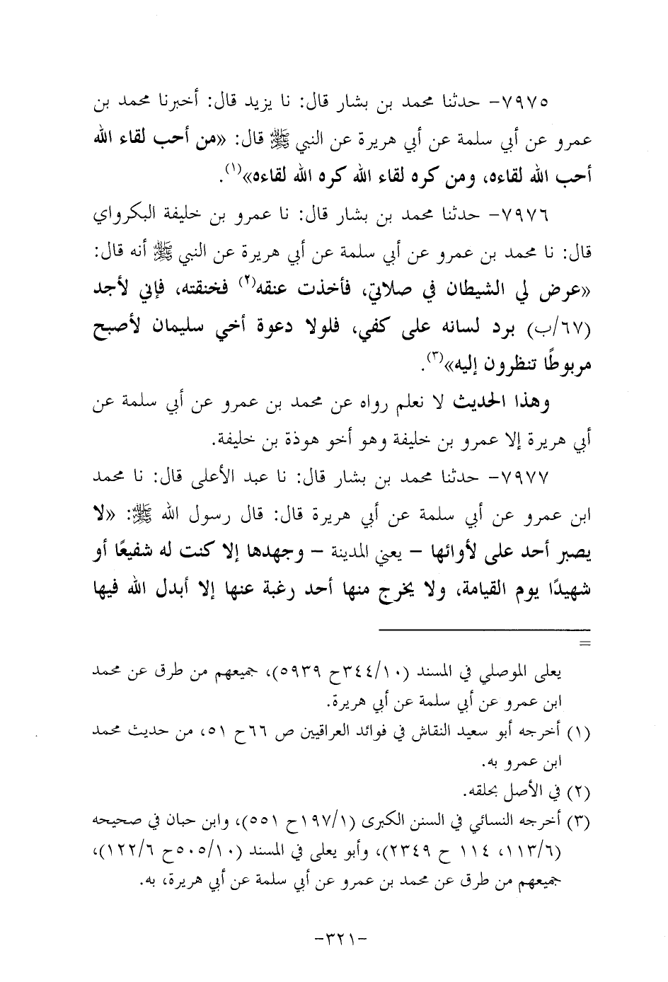 7975- حَدَّثنا مُحَمد بن بَشَّار، قَال: حَدَّثنا يزيد، قال: أَخْبَرنا مُحَمد بن عَمْرو، عَن أبي سَلَمَة، عَن أَبِي هُرَيرة، عَن النَّبِيّ صَلَّى اللَّهُ عَلَيه وَسَلَّم قال: من أحب لقاء الله أَحَبَّ اللَّهُ لِقَاءَهُ، وَمَنْ كَرِهَ لِقَاءَ اللَّهِ كره الله لقاءه.