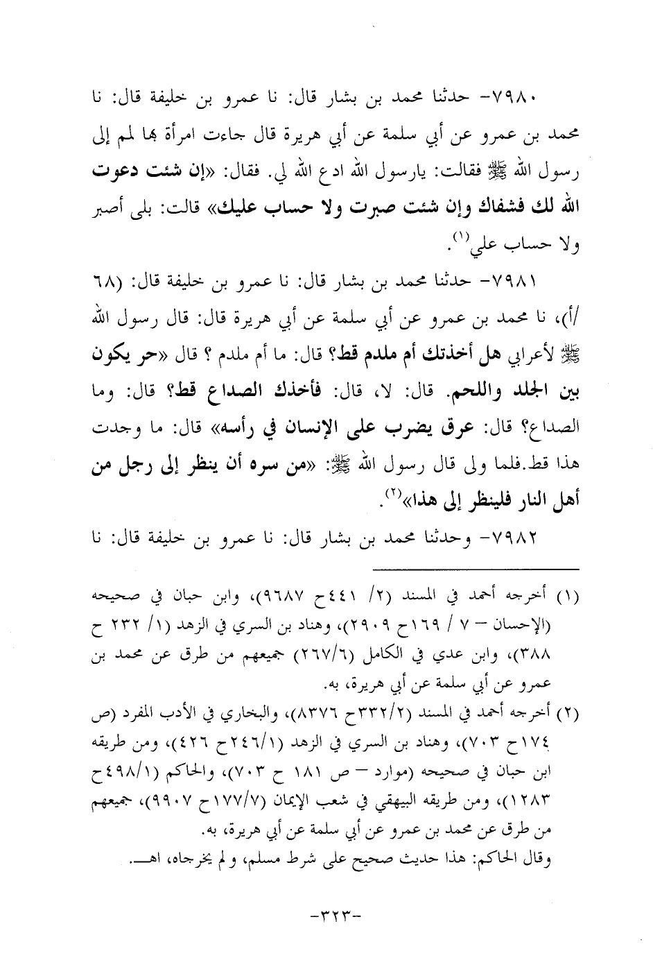 7980- حَدَّثنا مُحَمد بن بَشَّار، قَال: حَدَّثنا عَمْرو بن خليفة، قَال: حَدَّثنا مُحَمد بن عَمْرو، عَن أبي سَلَمَة، عَن أبي هُرَيرة، قال جاءت امرأة بها لمم إِلَى رَسُولِ اللَّهِ صَلَّى اللَّهُ عَلَيه وَسَلَّم فقالت: يا رَسولَ اللهِ ادع الله لي. فقال: إن شئت دعوت الله لك فشفاك، وَإن شئت صبرت، ولاَ حساب عليك قالت: بلى أصبر، ولاَ حساب علي.