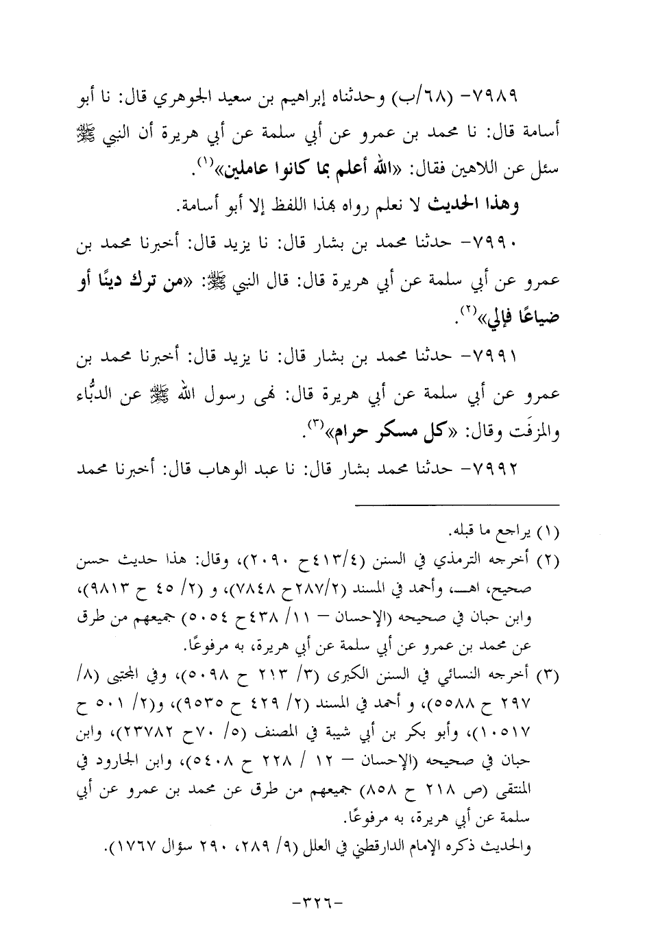 7990- حَدَّثنا مُحَمد بن بَشَّار، قَال: حَدَّثنا يزيد، قال: أَخْبَرنا مُحَمد بن عَمْرو، عَن أبي سَلَمَة، عَن أبي هُرَيرة، قَالَ: قَالَ النَّبِيّ صَلَّى اللَّهُ عَلَيه وَسَلَّم: من ترك دينا، أو ضياعا فإلي.