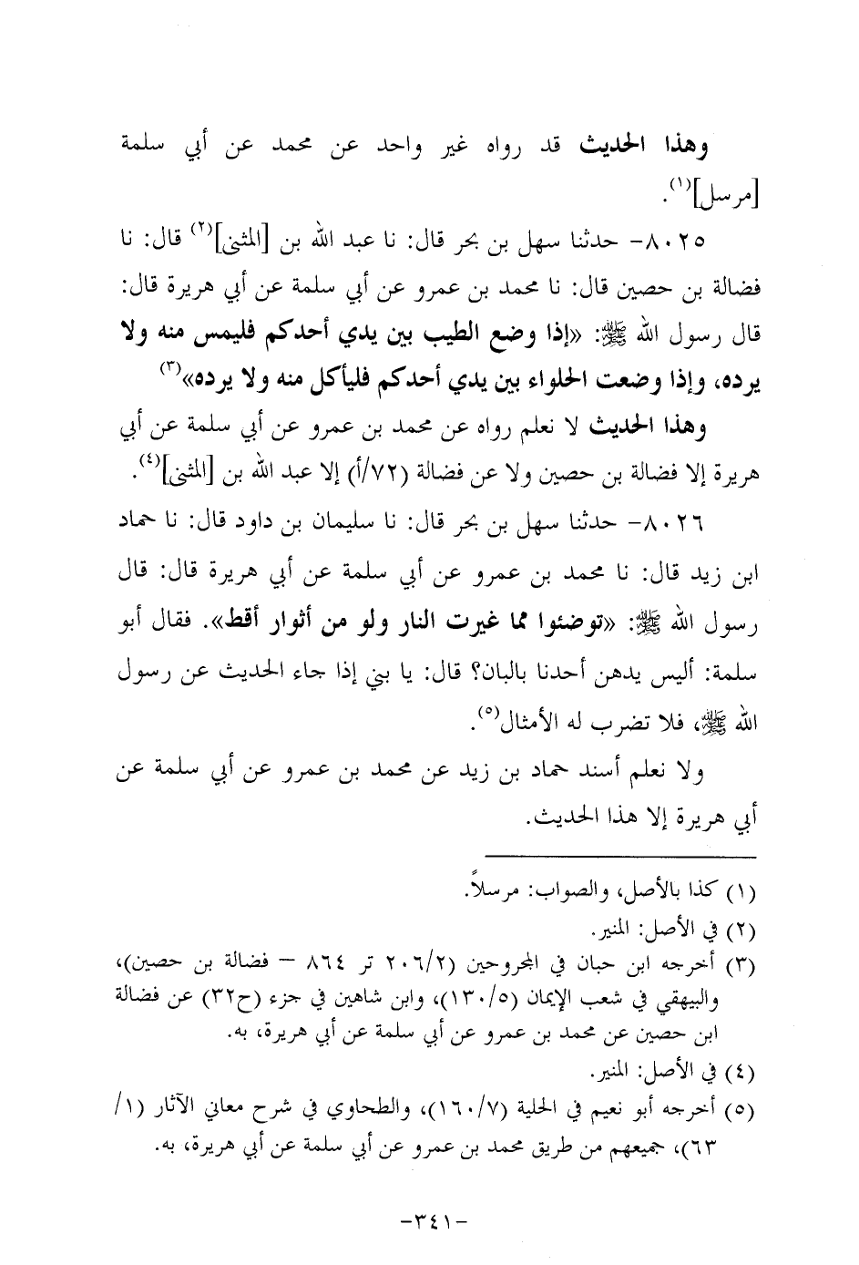 8026- حَدَّثنا سَهْل بن بحر، قَال: حَدَّثنا سُلَيْمان بن داود، قَال: حَدَّثنا حماد بن زيد، قَال: حَدَّثنا مُحَمد بن عَمْرو، عَن أبي سَلَمَة، عَن أبي هُرَيرة، قَالَ: قَالَ رَسُول اللهِ صَلَّى اللَّهُ عَلَيه وَسَلَّم: توضؤُوا مما غيرت النار، ولو من أثوار أقط. فقال أَبُو سلمة: أليس يدهن أحدنا بالبان؟ قال: يا بني إذا جاء الحديث عَنْ رَسُولِ اللَّهِ صَلَّى اللَّهُ عَلَيه وَسَلَّم فلا تضرب له الأمثال.