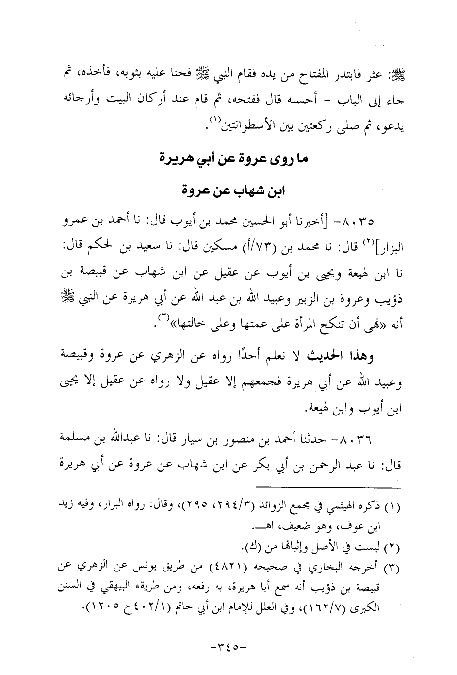 8035- أخبرنا أَبُو الحسين مُحَمد بن أيوب، قَال: حَدَّثنا أحمد بن عَمْرو البزار، قَال: حَدَّثنا مُحَمد بن مسكين، قَال: حَدَّثنا سَعِيد بن الحكم، قَال: حَدَّثنا ابن لهيعه ويحيى بن أيوب عن عُقَيل، عَن ابن شِهاب عن قَبِيصَة بن ذؤيب وعروة بن الزبير وعبيد الله بن عَبد الله، عَن أَبِي هُرَيرة، عَن النَّبِيّ صَلَّى اللَّهُ عَلَيه وَسَلَّم؛ أَنَّه: نَهَى أَنْ تُنْكَحَ الْمَرْأَةُ عَلَى عَمَّتِهَا وَعَلَى خالتها.