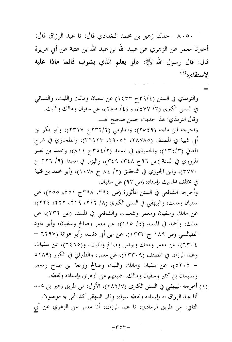 8050- حَدَّثنا زهير بن مُحَمد البغدادي، قَال: حَدَّثنا عَبد الرزاق، قال: أَخْبَرنا مَعْمَر، عَن الزُّهْرِيّ عَنْ عُبَيد اللَّهِ بْنِ عَبد الله بن عتبة، عَن أبي هُرَيرة، قَالَ: قَالَ رَسُول اللهِ صَلَّى اللَّهُ عَلَيه وَسَلَّم: لو يعلم الذي يشرب قائما ماذا عليه لاستقاء.