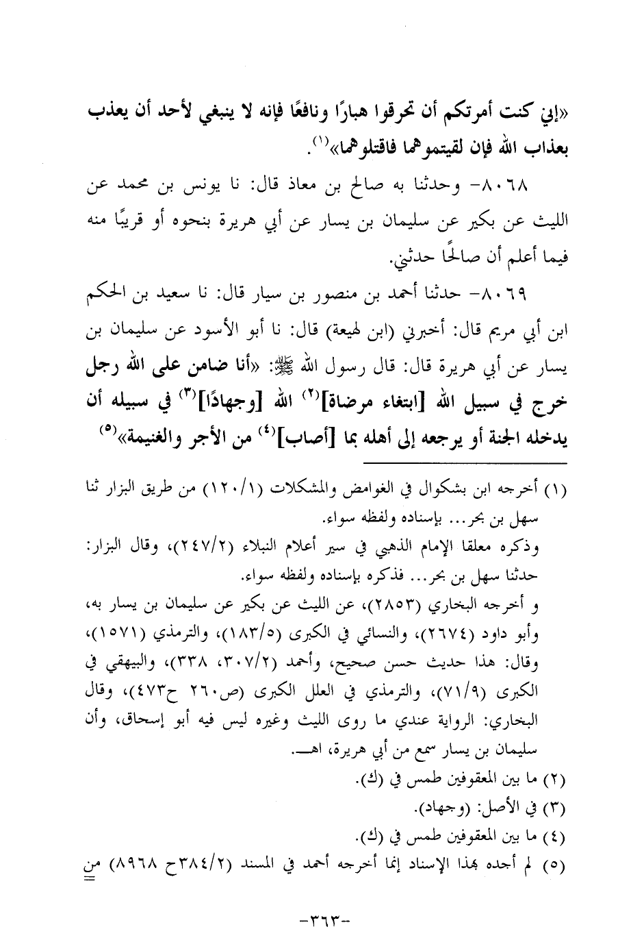 8069- حَدَّثنا أَحْمَدُ بْنُ مَنْصُورِ بْنِ سَيَّارٍ، قَال: حَدَّثنا سَعِيد بن الحكم بن أبي مريم، قَال: أَخْبَرني ابن لهيعة، قَال: حَدَّثنا أَبُو الأسود، عَن سُليمان بن يسار، عَن أبي هُرَيرة، قَالَ: قَالَ رَسُول اللهِ صَلَّى اللَّهُ عَلَيه وَسَلَّم: أنا ضامن على الله رجل خرج في سبيل الله ابتغاء مرضاة الله وجهادا في سبيله أن يدخله الجنة، أو يرجعه إلى أهله بما أصاب من الأجر والغنيمة.