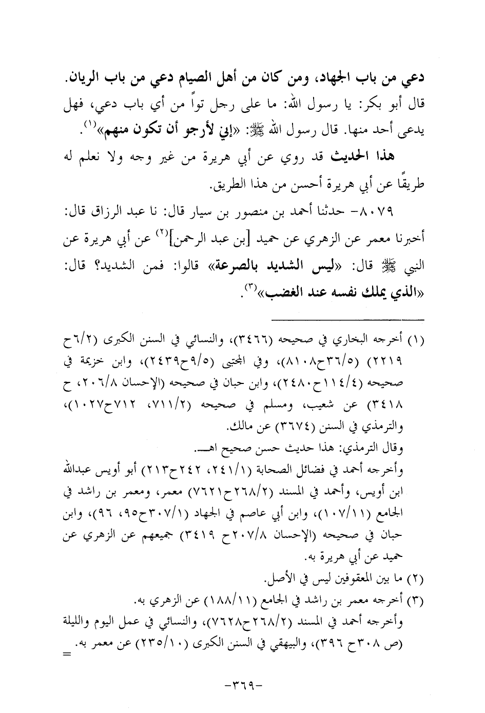 8079- حَدَّثنا أَحْمَدُ بْنُ مَنْصُورِ بْنِ سَيَّارٍ، قَال: حَدَّثنا عَبد الرزاق، قال: أَخْبَرنا مَعْمَر، عَن الزُّهْرِيّ عن حُمَيد بن عَبد الرحمن، عَن أَبِي هُرَيرة، عَن النَّبِيّ صَلَّى اللَّهُ عَلَيه وَسَلَّم قال: ليس الشديد بالصرعة قالوا: فمن الشديد؟ قال: الذي يملك نفسه عند الغضب.