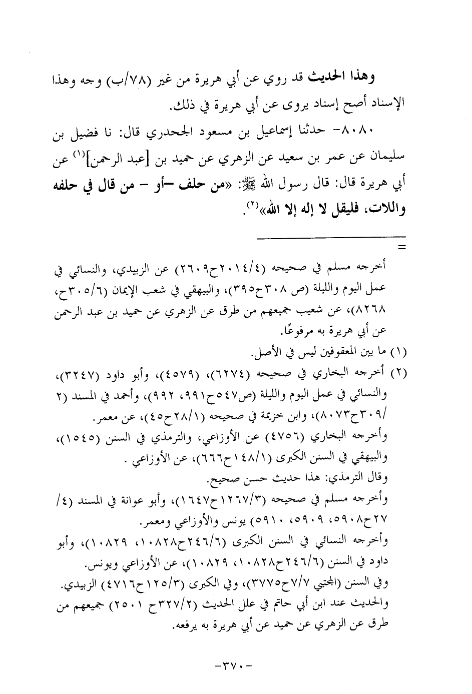 8080- حَدَّثنا إسماعيل بن مسعود الجحدري، قَال: حَدَّثنا فضيل بن سُلَيْمان عن عُمَر بن سَعِيد، عَن الزُّهْرِيّ عن حُمَيد بن عَبد الرحمن، عَن أبي هُرَيرة، قَالَ: قَالَ رَسُول اللهِ صَلَّى اللَّهُ عَلَيه وَسَلَّم: من حلف، أو من قال في حلفه واللات فليقل لا إله إلاَّ الله.