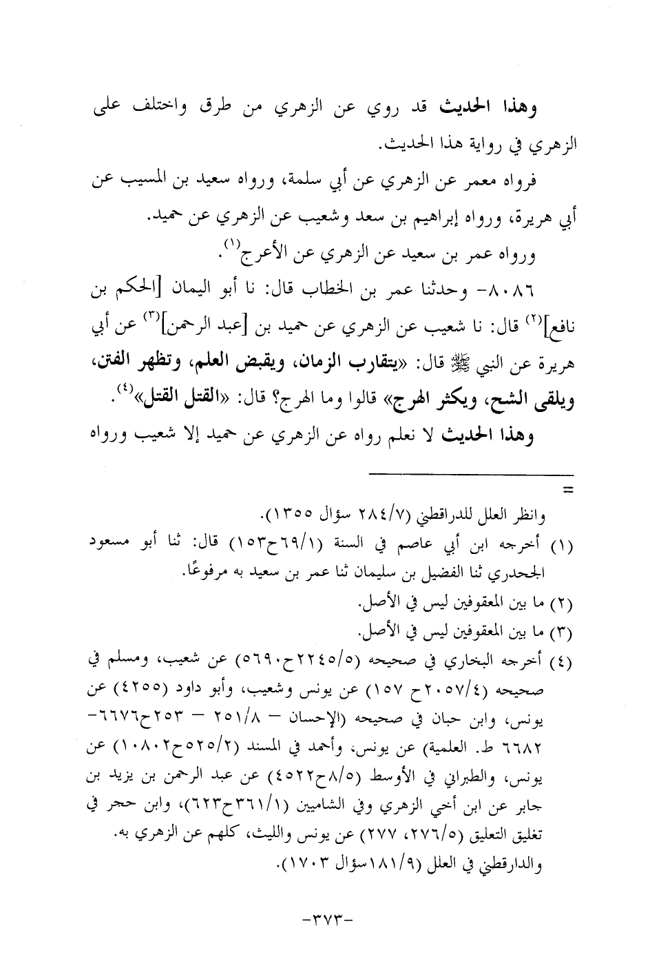 8086- وحَدَّثنا عُمَر بن الخطاب، قَال: حَدَّثنا أَبُو اليمان الحكم بن نافع، قَال: حَدَّثنا شعيب، عَن الزُّهْرِيّ عن حُمَيد بن عَبد الرحمن، عَن أَبِي هُرَيرة، عَن النَّبِيّ صَلَّى اللَّهُ عَلَيه وَسَلَّم قال: يتقارب الزمان ويقبض العلم وتظهر الفتن ويلقى الشح ويكثر الهرج قالوا وما الهرج؟ قال: القتل القتل.