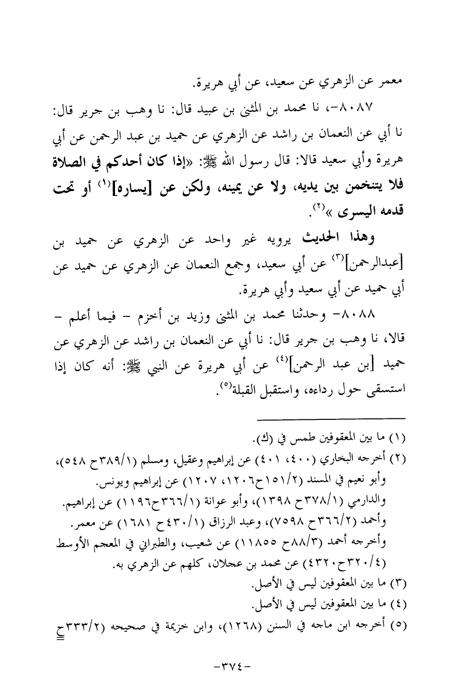 8087- حَدَّثَنا مُحَمَّدُ بْنُ الْمُثَنَّى بْنِ عُبَيد، قَال: حَدَّثنا وهب بن جرير، قَال: حَدَّثنا أبي عن النعمان بن راشد، عَن الزُّهْرِيّ عن حُمَيد بن عَبد الرحمن، عَن أبي هُرَيرة، وأبي سَعِيد قَالا: قَالَ رَسُول اللهِ صَلَّى اللَّهُ عَلَيه وَسَلَّم: إِذَا كَانَ أَحَدُكُمْ فِي الصَّلاةِ فَلا يَتَنَخَّمَنَّ بَيْنَ يَدَيْهِ، ولاَ عَن يَمِينِهِ، وَلكن عَنْ يساره، أو تحت قدمه اليسرى.