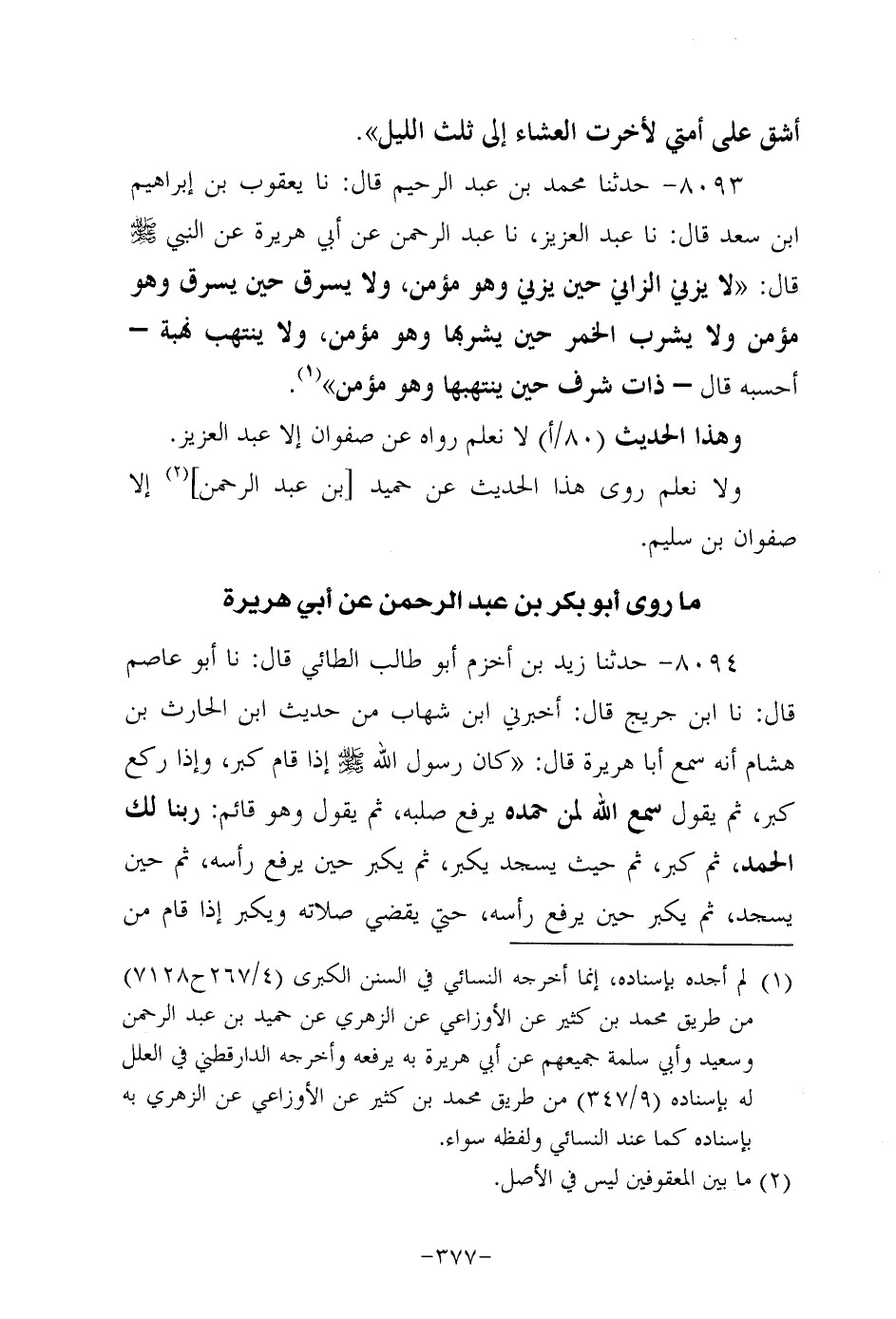 8093- حَدَّثنا مُحَمد بن عَبد الرحيم، قَال: حَدَّثنا يعقوب بن إبراهيم بن سَعْد، قَال: حَدَّثنا عَبد العزيز، حَدَّثنا عَبد الرحمن، عَن أَبِي هُرَيرة، عَن النَّبِيّ صَلَّى اللَّهُ عَلَيه وَسَلَّم، قَال: لاَ يزني الزاني حين يزني، وهُو مؤمن، ولاَ يسرق حين يسرق، وهُو مؤمن، ولاَ يشرب الخمر حين يشربها، وهُو مؤمن، ولاَ ينتهب نهبة، أَحسَبُهُ قال - ذات شرف حين ينتهبها، وهُو مؤمن.