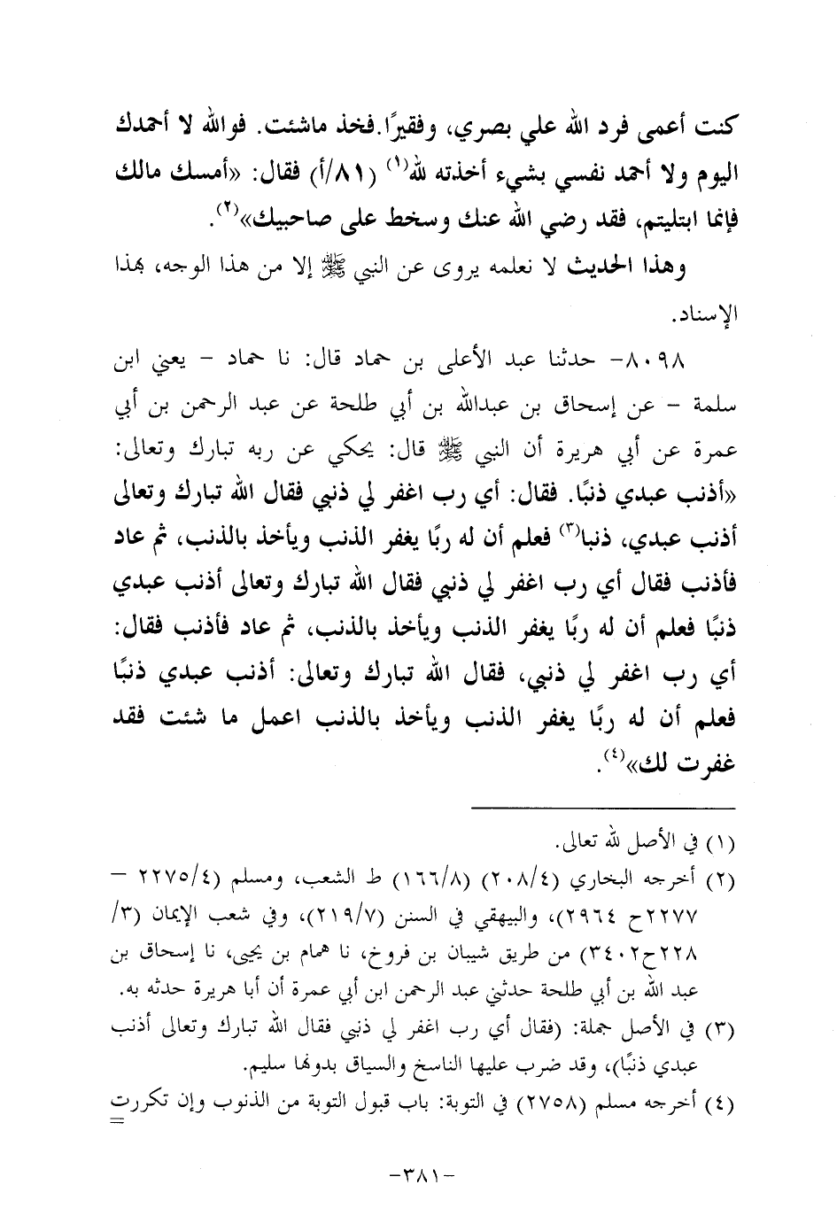 8098- حَدَّثنا عَبد الأعلى بن حماد، قَال: حَدَّثنا حماد، يعني ابن سلمة، عَنْ إِسْحَاقَ بْنِ عَبد اللَّهِ بْنِ أَبِي طلحة عن عَبد الرحمن بن أبي عمرة، عَن أبي هُرَيرة؛ أَنَّ النَّبِيّ صَلَّى اللَّهُ عَلَيه وَسَلَّم قَالَ: يحكي عن ربه تبارك وتعالى: أذنب عَبدي ذنبا فقال أي رب اغفرلي ذنبي فقال الله تبارك وتعالى أذنب عبدي ذنبا فعلم أن له ربا يغفر الذنب ويأخذ بالذنب، ثُمَّ عاد فأذنب فقال أي رب اغفر لي ذنبي فقال الله تبارك وتعالى أذنب عَبدي ذنبا فعلم أن له ربا يغفر الذنب ويأخذ بالذنب، ثُمَّ عاد فأذنب فقال: أي رب اغفر لي ذنبي فقال الله تبارك وتعالى: أذنب عَبدي ذنبا فعلم أن له ربا يغفر الذنب ويأخذ بالذنب اعمل ما شئت فقد غفرت لَكَ.