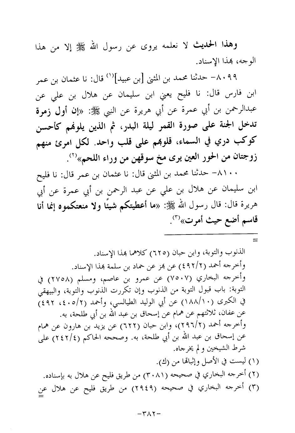 8099- حَدَّثَنا مُحَمَّدُ بْنُ الْمُثَنَّى بْنِ عُبَيد، قَال: حَدَّثنا عثمان بن عُمَر بن فارس، قَال: حَدَّثنا فُلَيْحٌ، يَعْنِي ابْنَ سُلَيْمان عَنْ هِلالِ بْنِ علي عن عَبد الرحمن بن أبي عمرة، عَن أَبِي هُرَيرة، عَن النَّبِيّ صَلَّى اللَّهُ عَلَيه وَسَلَّم: إن أول زمرة تدخل الجنة على صورة القمر ليلة البدر، ثُمَّ الذين يلونهم كأحسن كوكب دري في السماء قلوبهم على قلب واحد لكل امرىء منهم زوجتان من الحور العين يرى مخ سوقهن من وراء اللحم.