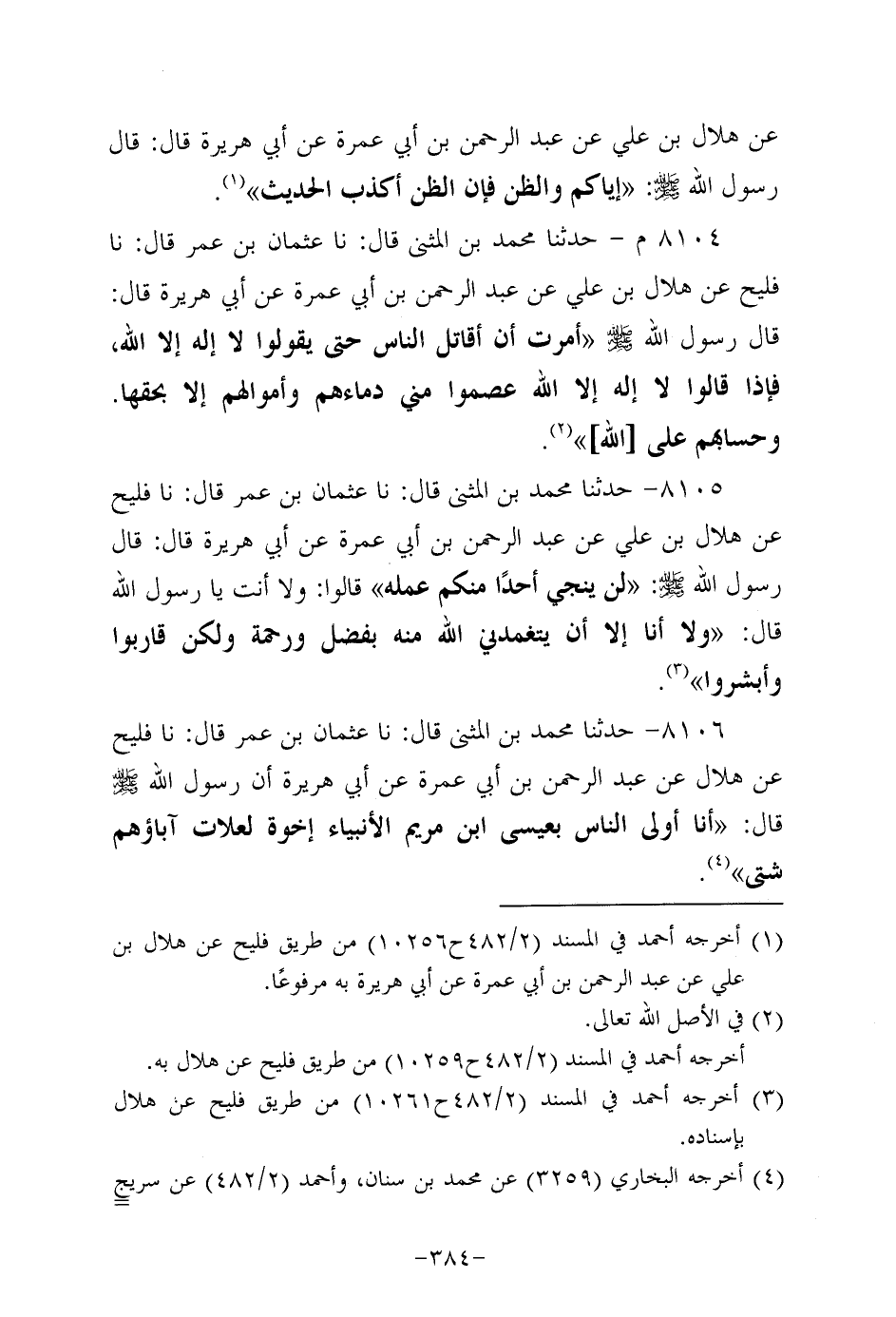 8104م- حَدَّثَنا مُحَمَّدُ بْنُ الْمُثَنَّى، قَال: حَدَّثنا عثمان بن عُمَر، قَال: حَدَّثنا فليح عن هلال بن علي عن عَبد الرحمن بن أبي عمرة، عَن أبي هُرَيرة، قَالَ: قَالَ رَسُول اللهِ صَلَّى اللَّهُ عَلَيه وَسَلَّم: أُمِرْتُ أَن أُقَاتِلَ النَّاسَ حَتَّى يَقُولُوا لا إله إلاَّ الله فإذا قالوا لا إله إلاَّ الله عصموا مني دماءهم وأموالهم إلاَّ بحقها وحسابهم على الله.