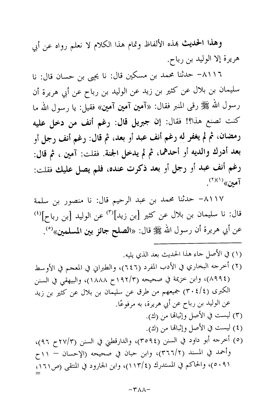 8117- حَدَّثنا مُحَمد بن عَبد الرحيم، قَال: حَدَّثنا منصور بن سلمة، قَال: حَدَّثنا سُلَيْمان بن بلال عن كثير بن زيد، عَن الوليد بن رباح، عَن أبي هُرَيرة؛ أَنَّ رَسُولَ اللهِ صَلَّى اللَّهُ عَلَيه وَسَلَّم قال: الصلح جائز بين المسلمين.