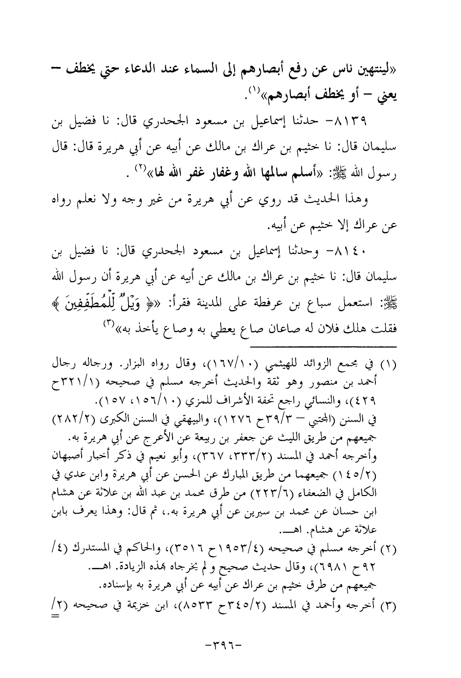 8140- وحَدَّثنا إسماعيل بن مسعود الجحدري، قَال: حَدَّثنا فضيل بن سُلَيْمان، قَال: حَدَّثنا خُثَيم بن عراك بن مالك، عَن أَبِيه، عَن أبي هُرَيرة؛ أَنَّ رَسُولَ اللهِ صَلَّى اللَّهُ عَلَيه وَسَلَّم استعمل سباع بن عرفطة على المدينة فقرأ: {ويل للطففين} فقلت هلك فلان له صاعان صاع يعطي به وصاع يأخذ بِهِ.