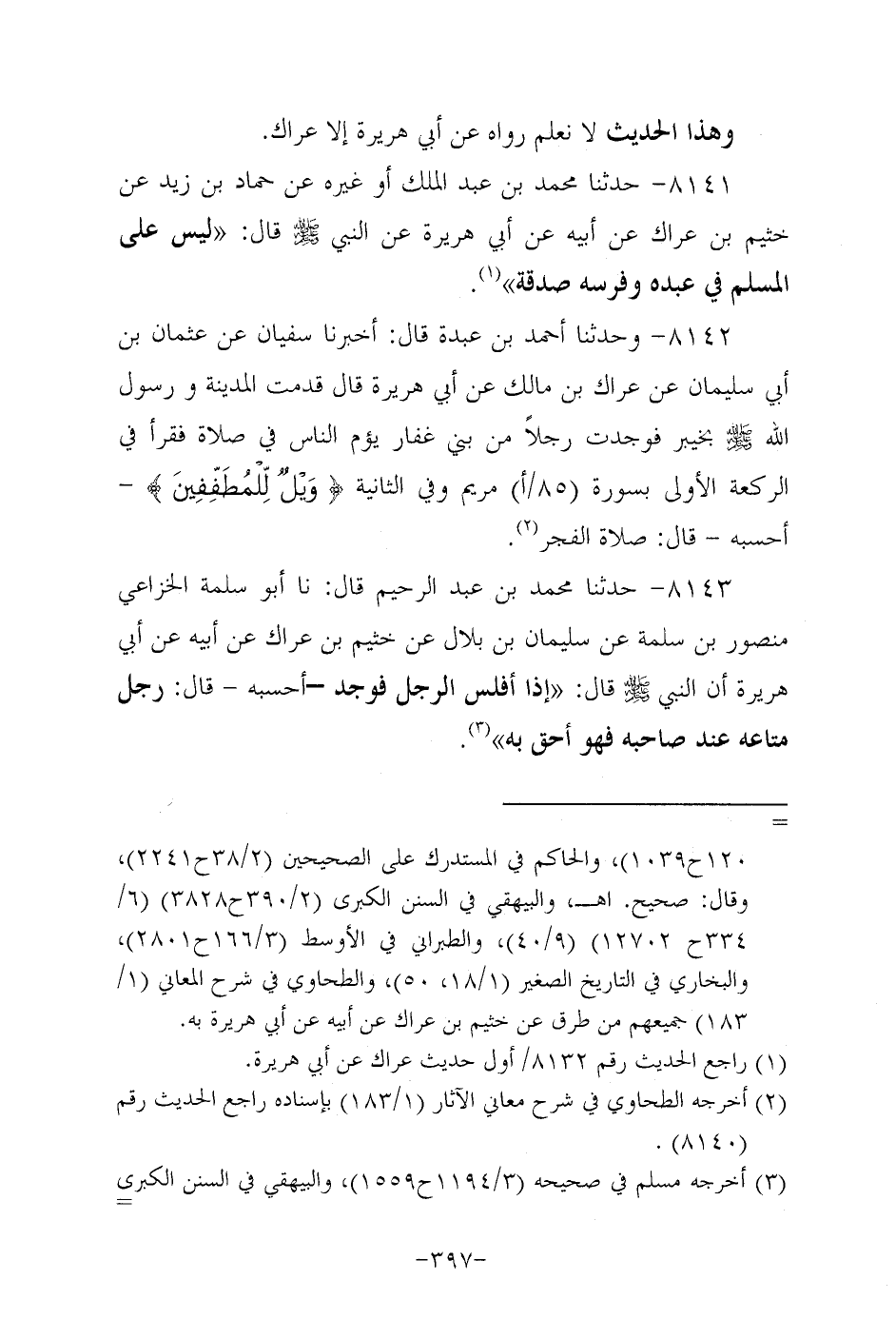 8141- حَدَّثنا مُحَمد بن عَبد الملك، أو غيره عن حماد بن زيد، عَن خُثَيم بن عراك، عَن أَبِيه، عَن أَبِي هُرَيرة، عَن النَّبِيّ صَلَّى الله عَلَيه وَسَلَّم قال: ليس على المسلم في عَبده وفرسه صدقة.