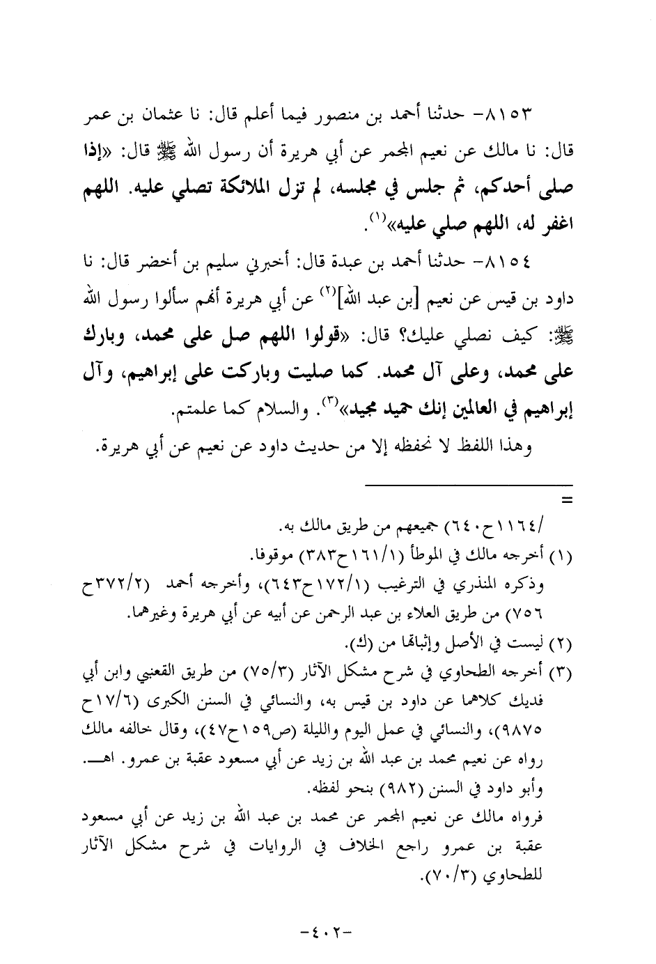 8154- حَدَّثنا أَحمد بن عَبدة، قَال: أَخْبَرني سليم بن أخضر، قَال: حَدَّثنا داود بن قيس، عَن نعيم بن عَبد الله، عَن أبي هُرَيرة؛ أنهم سَأَلُوا رَسُولَ اللَّهِ صَلَّى اللَّهُ عَلَيه وَسَلَّم: كيف نصلي عليك؟ قال: قولوا اللهم صل على مُحَمد وبارك على مُحَمد وعلى آل مُحَمد كما صليت وباركت على إبراهيم وآل إبراهيم في العالمين إنك حُمَيد مجيد. والسلام كما علمتم.