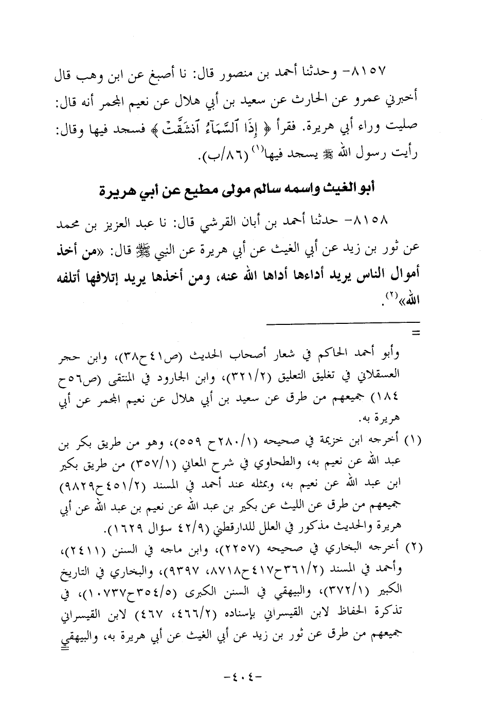 8158- حَدَّثنا أحمد بن أَبَان القرشي، قَال: حَدَّثنا عَبد العزيز بن مُحَمد، عَن ثور بن زيد، عَن أبي الغيث، عَن أَبِي هُرَيرة، عَن النَّبِيّ صَلَّى اللَّهُ عَلَيه وَسَلَّم قال: من أخذ أموال الناس يريد أداءها أداها الله عنه، وَمَنْ أخذها يريد إتلافها أتلفه اللَّهُ.