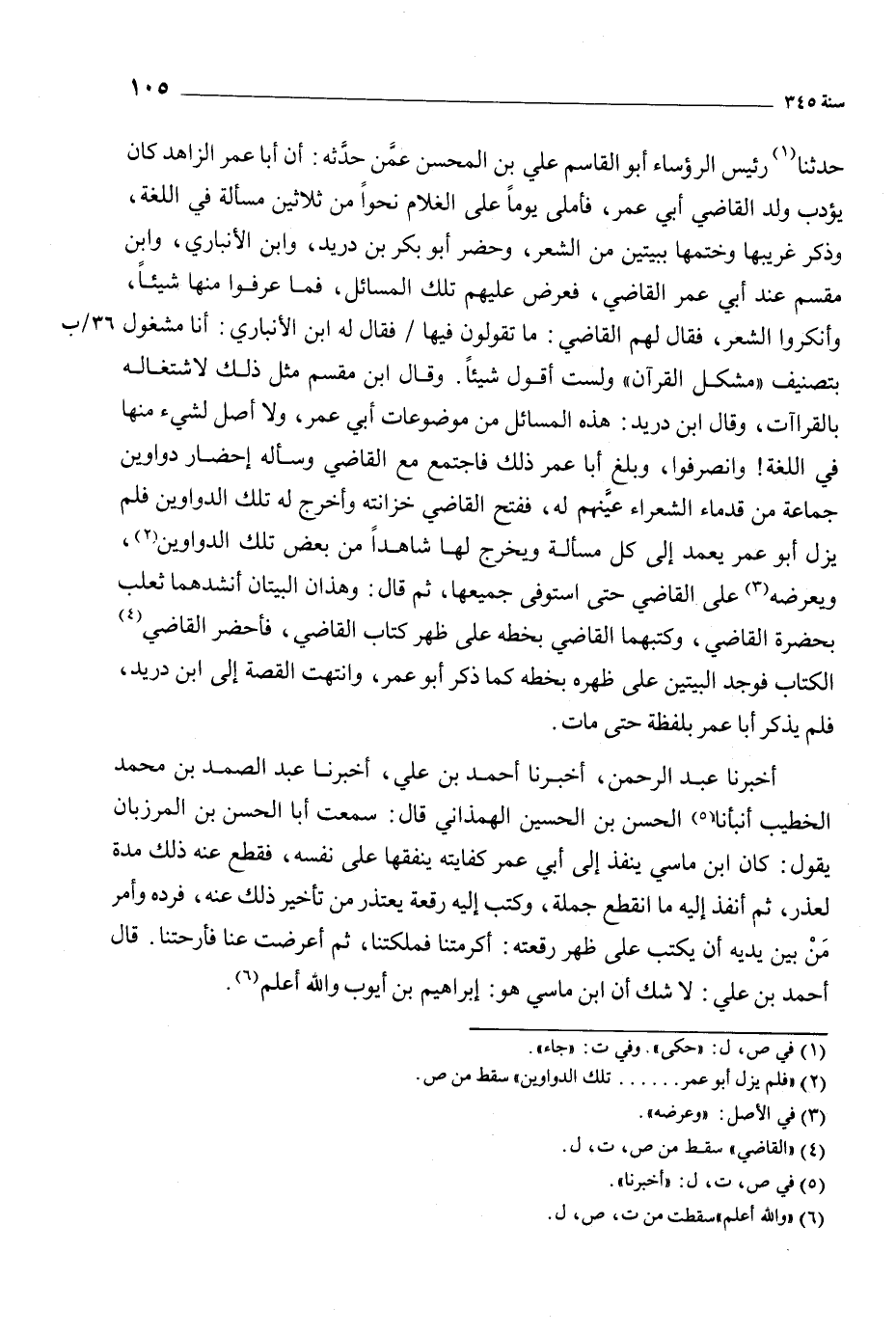 أخبرنا عبد الرحمن، أخبرنا أحمد بن علي، أخبرنا عبد الصمد بن محمد الخطيب أنبأنا [5] الحسن بن الحسين الهمذاني قال: سمعت أبا الحسن بن المرزبان يقول: كان ابن ماسي ينفذ إلى أبي عمر كفايته ينفقها على نفسه، فقطع عنه ذلك مدة لعذر، ثم أنفذ إليه ما انقطع جملة، وكتب إليه رقعة يعتذر من تأخير ذلك عنه، فرده وأمر من بين يديه أن يكتب على ظهر رقعته: أكرمتنا فملكتنا، ثم أعرضت عنا فأرحتنا. قال أحمد بن علي: لا شك أن ابن ماسي هو: إبراهيم بن أيوب والله أعلم [6] .