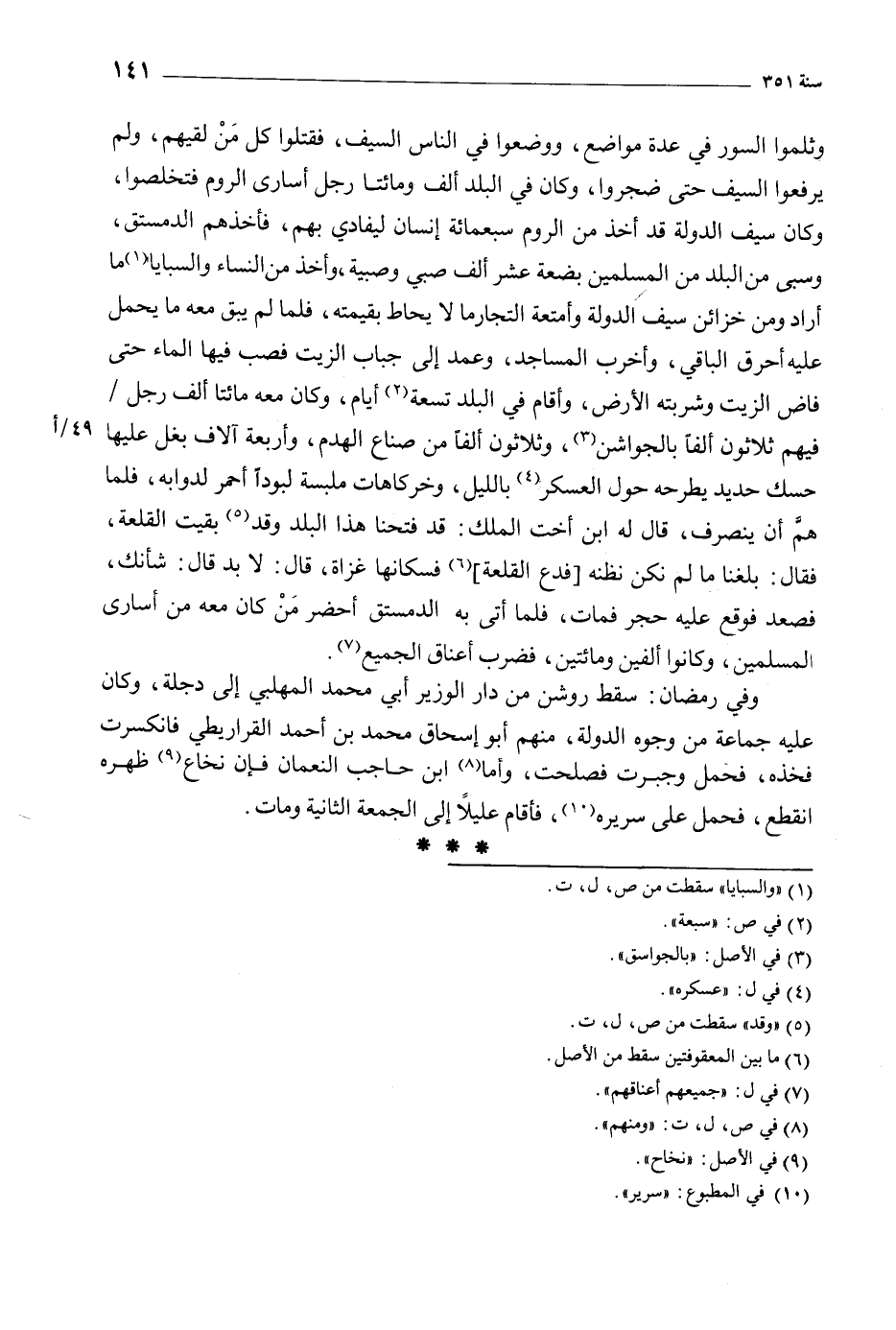وثلموا السور في عدة مواضع، ووضعوا في الناس السيف، فقتلوا كل من لقيهم، ولم يرفعوا السيف حتى ضجروا، وكان في البلد ألف ومائتا رجل أسارى الروم فتخلصوا، وكان سيف الدولة قد أخذ من الروم سبعمائة إنسان ليفادى بهم، فأخذهم الدمستق، وسبي من البلد من المسلمين بضعة عشر ألف صبي وصبية، وأخذ من النساء والسبايا [1] ما أراد ومن خزائن سيف الدولة وأمتعة التجار ما لا يحاط بقيمته، فلما لم يبق معه ما يحمل عليه أحرق الباقي، وأخرب المساجد، وعمد إلى جباب الزيت فصب فيها الماء حتى فاض الزيت وشربته الأرض، وأقام في البلد تسعة [2] أيام، وكان معه مائتا ألف رجل/ فيهم ثلاثون ألفا بالجواشن [3] ، وثلاثون ألفا من صناع الهدم، وأربعة آلاف بغل عليها حسك حديد يطرحه حول العسكر [4] بالليل، وخركاهات ملبسة لبودًا أحمر لدوابه، فلما همَّ أن ينصرف، قال له ابن أخت الملك: قد فتحنا هذا البلد وقد [5] بقيت القلعة، فقال: بلغنا ما لم نكن نظنه [فدع القلعة] [6] فسكانها غزاة، قال: لا بد قال: شأنك، فصعد فوقع عليه حجر فمات، فلما أتى به الدمستق أحضر مَنْ كان معه من أسارى المسلمين، وكانوا ألفين ومائتين، فضرب أعناق الجميع [7] .