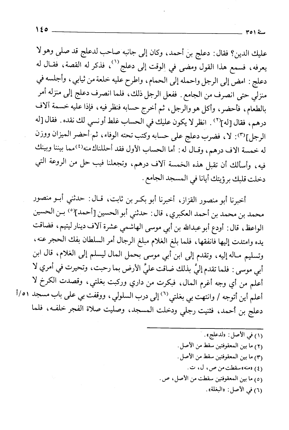 أَخْبَرَنَا أَبُو مَنْصُورٍ الْقَزَّازُ، أَخْبَرَنَا أَبُو بَكْرٍ بن ثابت، قال: حدثني أبو منصور محمد بن محمد بن أحمد العُكْبري، قال: حدثني أبو الحسين [أحمد] [5] بن الحسين الواعظ، قال: أودع أبو عبد الله بن أبي موسى الهاشمي عشرة آلاف دينار ليتيم، فضاقت يده وامتدت إليها فأنفقها، فلما بلغ الغلام مبلغ الرجال أمر السلطان بفك الحجر عنه، وتسليم ماله إليه، وتقدم إلى ابن أبي موسى بحمل المال ليسلم إلى الغلام، قال ابن أبي موسى: فلما تقدم إلي بذلك ضاقت على الأرض بما رحبت، وتحيرت في أمري لا أعلم من أي وجه أغرم المال، فبكرت من داري وركبت بغلتي، وقصدت الكرخ لا أعلم اين أتوجه/ وانتهت بي بغلتي [6] إلى درب السلولي، ووقفت بي على باب مسجد دعلج بن أحمد، فثنيت رجلي ودخلت المسجد، وصليت صلاة الفجر خلفه، فلما