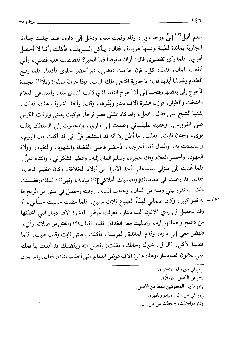 يثبتها الشيخ علي فقال: أفعل، وقد كاد عقلي يطير فرحًا، فركبت بغلتي وتركت الكيس على القربوس، وغطيته بطيلساني وعدت إلى داري، وانحدرت إلى السلطان بقلب قوي، وجنان ثابت، فقلت: ما أظن إلا أنه قد استشعر فيَّ أني قد أكلت مال اليتيم، واستبددت به، والمال فقد أخرجته، فاحضر قاضي القضاة والشهود، والنقباء، وولاة العهود، وأحضر الغلام وفك حجره، وسلم المال إليه، وعظم الشكر لي، والثناء عليَّ، فلما عُدت إلى منزلي استدعاني أحد الأمراء من أولاد الخلافة، وكان عظيم الحال، فقال: قد رغبت في معاملتك [وتضمينك أملاكي] [3] ببادية يا ونهر [4] الملك، فضمنت ذلك بما تقرر بيني وبينه من المال، وجاءت السنة، ووفيته وحصل في يدي من الربح ما له قدر كبير، وكان ضماني لهذه الضياع ثلاث سنين، فلما مضت حسبت حسابي، / وقد تحصل في يدي ثلاثون ألف دينار، فعزلت عوض العشرة آلاف دينار التي أخذتها من دعلج وحملتها إليه، وصليت معه الغداة، فلما انفتلت [5] وانفتل من صلاته رأني، فنهض معي إلى داره، وقدم المائدة والهريسة، فأكلت بجأش ثابت وقلب طيب، فلما قضينا الأكل، قال لي: خبرك وحالك، فقلت: بفضل الله وبفضلك قد أفدت بما فعلته معي ثلاثون ألف دينار، وهذه عشرة آلاف عوض الدنانير التي أخذتها منك، فقال: يا سبحان