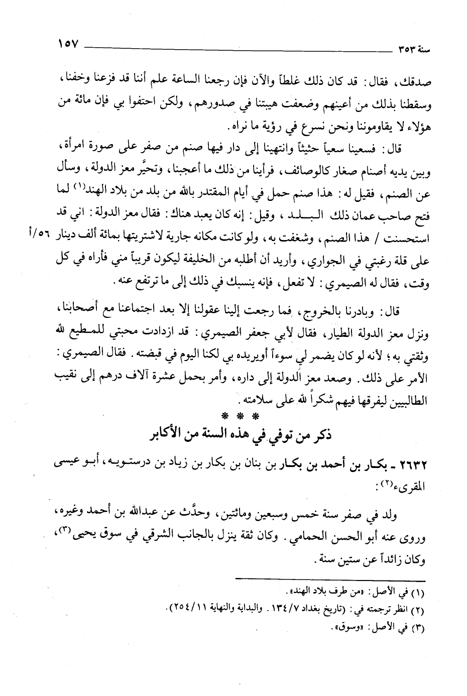 قال: فسعينا سعيًا حثيثًا وانتهينا إلى دار فيها صنم من صفر على صورة امرأة، وبين يديه أصنام صغار كالوصائف، فرأينا من ذلك ما أعجبنا، وتحير معز الدولة، وسأل عن الصنم، فقيل له: هذا صنم حمل في أيام المقتدر باللَّه من بلد من بلاد الهند [1] لما فتح صاحب عمان ذلك البلد، وقيل: إنه كان يعبد هناك: فقال معز الدولة: إني قد استحسنت/ هذا الصنم، وشغفت به، ولو كانت مكانه جارية لاشتريتها بمائة ألف دينار على قلة رغبتي في الجواري، وأريد أن أطلبه من الخليفة ليكون قريبا مني فأراه في كل وقت، فقال له الصيمري: لا تفعل، فإنه ينسبك في ذلك إلى ما ترتفع عنه.