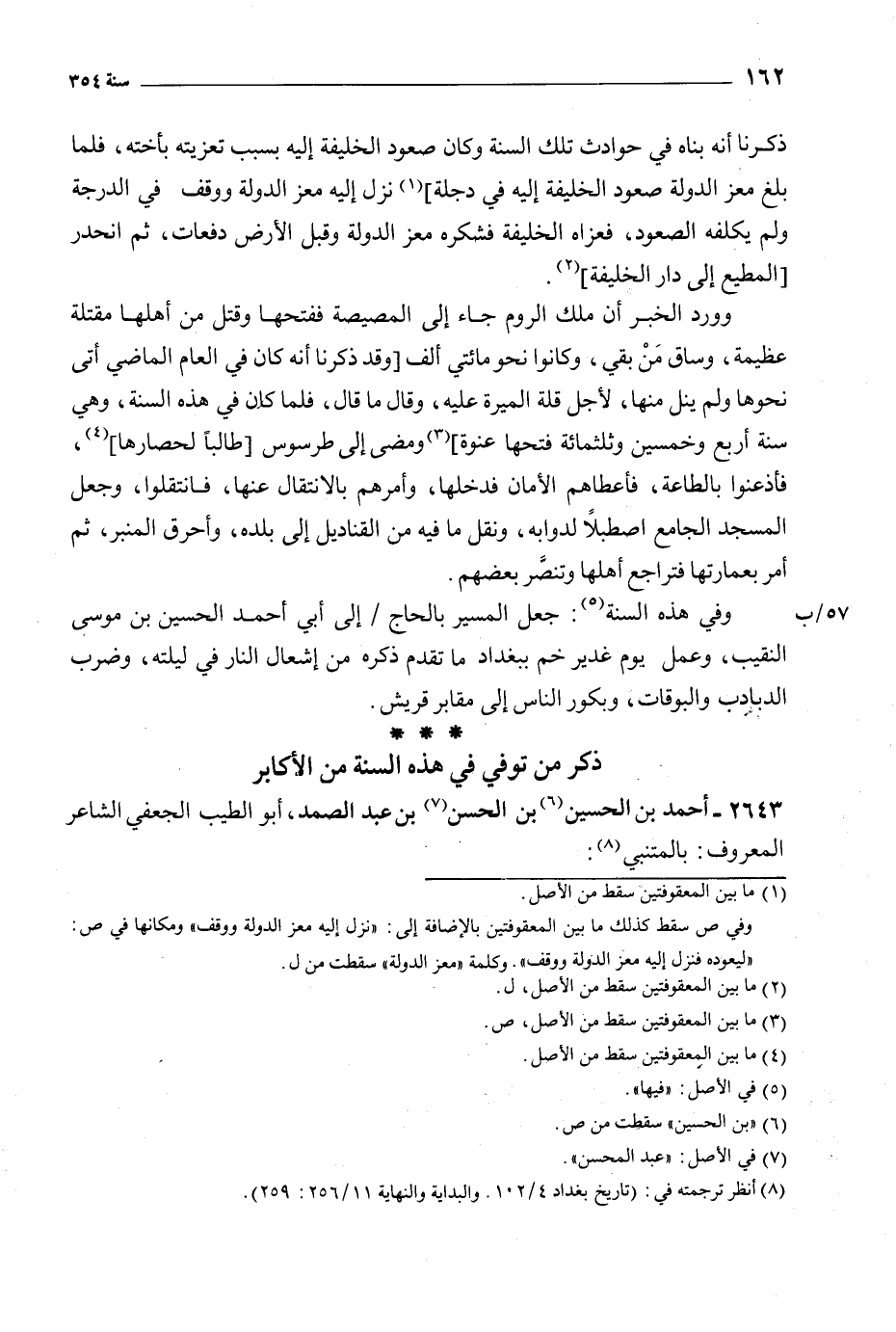 وورد الخبر أن ملك الروم جاء إلى المصيصة ففتحها وقتل من أهلها مقتلة عظيمة، وساق من بقي، وكانوا نحو مائتي ألف [وقد ذكرنا أنه كان في العام الماضي أتى نحوها ولم ينل منها، لأجل قلة الميرة عليه، وقال ما قال، فلما كان في هذه السنة، وهي سنة أربع وخمسين وثلاثمائة فتحها عنوة] [3] ومضى إلى طرسوس [طالبًا لحصارها] [4] ، فأذعنوا بالطاعة، فأعطاهم الأمان فدخلها، وأمرهم بالانتقال عنها، فانتقلوا، وجعل المسجد الجامع اصطبلا لدوابه، ونقل ما فيه من القناديل إلى بلده، وأحرق المنبر، ثم أمر بعمارتها فتراجع أهلها وتنصر بعضهم.