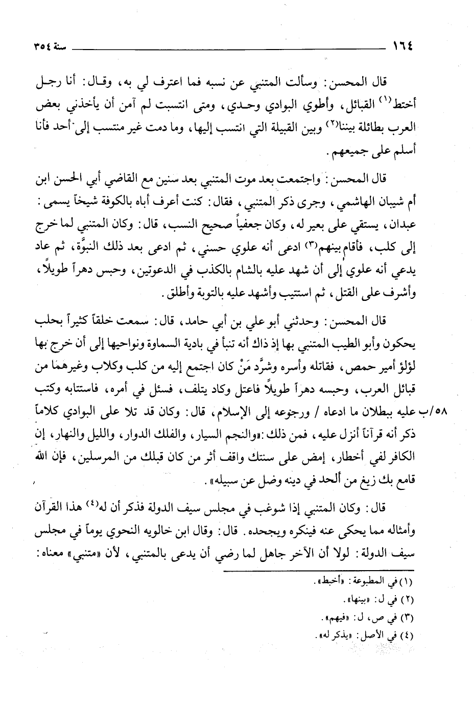 قال المحسن: وحدثني أبو علي بن أبي حامد، قال: سمعت خلقا كثيرًا بحلب يحكون وأبو الطيب المتنبي بها إذ ذاك أنه تنبأ في بادية السماوة ونواحيها إلى أن خرج بها لؤلؤ أمير حمص، فقاتله وأسره وشرد من كان اجتمع إليه من كلب وكلاب وغيرهما من قبائل العرب، وحبسه دهرًا طويلا فاعتل وكاد يتلف، فسئل في أمره، فاستتابه وكتب عليه ببطلان ما ادعاه/ ورجوعه إلى الإسلام، قال: وكان قد تلا على البوادي كلامًا ذكر أنه قرآنا أنزل عليه، فمن ذلك: «والنجم السيار، والفلك الدوار، والليل والنهار، إن الكافر لفي أخطار، امض على سنتك واقف أثر من كان قبلك من المرسلين، فإن الله قامع بك زيغ من أَلْحَدَ في دينه وضل عن سبيله» .