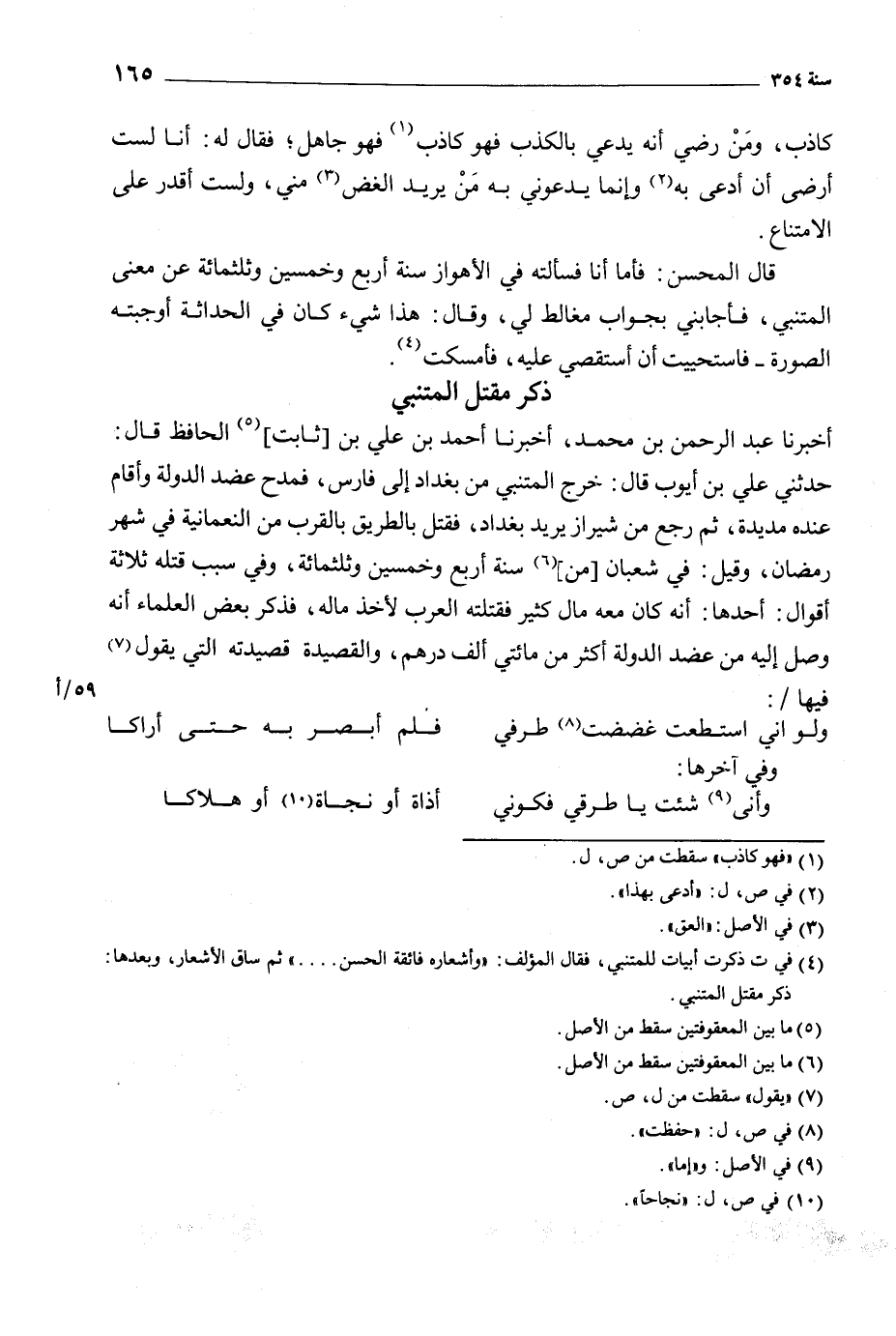 حدثني علي بن أيوب قال: خرج المتنبي من بغداد إلى فارس، فمدح عضد الدولة وأقام عنده مديدة، ثم رجع من شيراز يريد بغداد، فقتل بالطريق بالقرب من النعمانية في شهر رمضان، وقيل: في شعبان [من] [6] سنة أربع وخمسين وثلاثمائة، وفي سبب قتله ثلاثة أقوال: أحدها: أنه كان معه مال كثير فقتلته العرب لأخذ ماله، فذكر بعض العلماء أنه وصل إليه من عضد الدولة أكثر من مائتي ألف درهم، والقصيدة قصيدته التي يقول [7] فيها/: