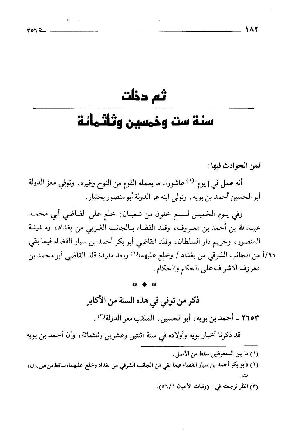 أنه عمل في [يوم] [1] عاشوراء ما يعمله القوم من النوح وغيره، وتوفي معز الدولة أبو الحسين أحمد بن بويه، وتولي ابنه عز الدولة أبو منصور بختيار.
