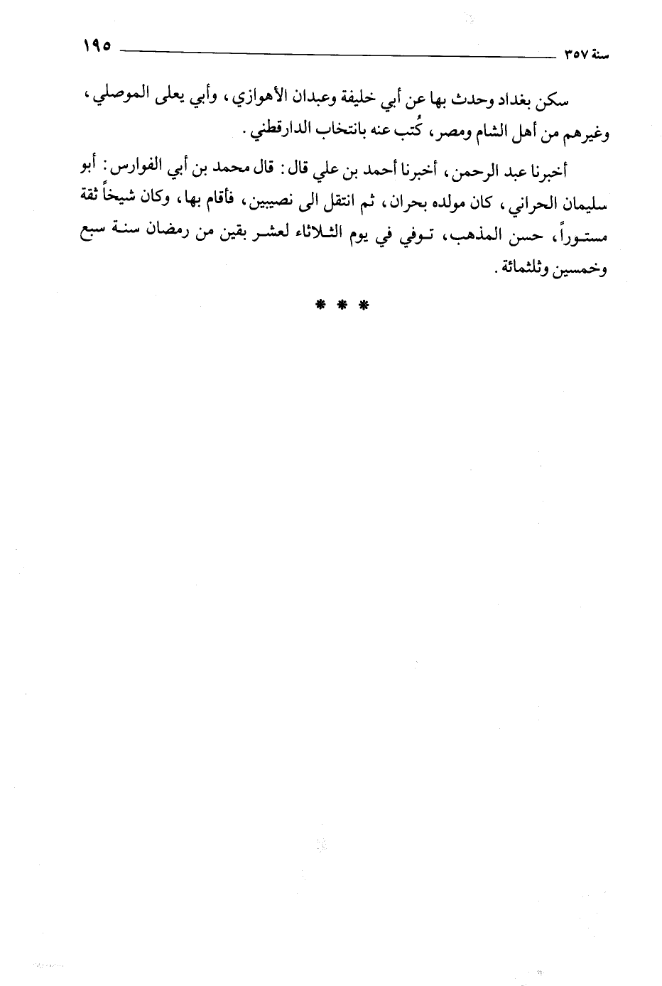 أخبرنا عبد الرحمن، أخبرنا أحمد بن علي قال: قال محمد بن أبي الفوارس: أبو سليمان الحراني، كان مولده بحران، ثم انتقل إلى نصيبين، فأقام بها، وكان شيخًا ثقة مستورًا، حسن المذهب، توفي في يوم الثلاثاء لعشر بقين من رمضان سنة سبع وخمسين وثلاثمائة.