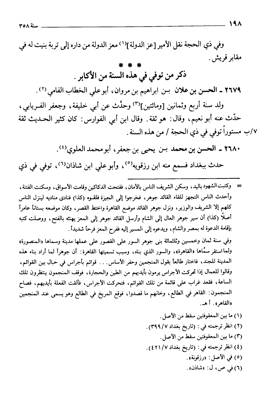 حدث ببغداد فسمع منه ابن رزقويه [5] ، وأبو علي ابن شاذان [6] ، توفي في ذي وكتبت الشهود باليد، وسكن الشريف الناس بالأمان، ففتحت الدكاكين وقامت الأسواق، وسكنت الفتنة، وأحدث الناس التجهز للقاء القائد جوهر، فخرجوا إلى الجيزة فلقوه (كذا) فنادى مناديه لينزل الناس كلهم إلا الشريف والوزير، ونزل جوهر القائد موضع القاهرة واختط القصر، وكان موضعه بستانا عامرا أصلا (كذا) أن سير جوهر العال إلى الشام وأرسل القائد جوهر إلى المعز يهنئه بالفتح، ووصلت كتبه بإقامة الدعوة له بمصر والشام، ويدعوه إلى المسير إليه ففرح المعز فرحا شديدا.