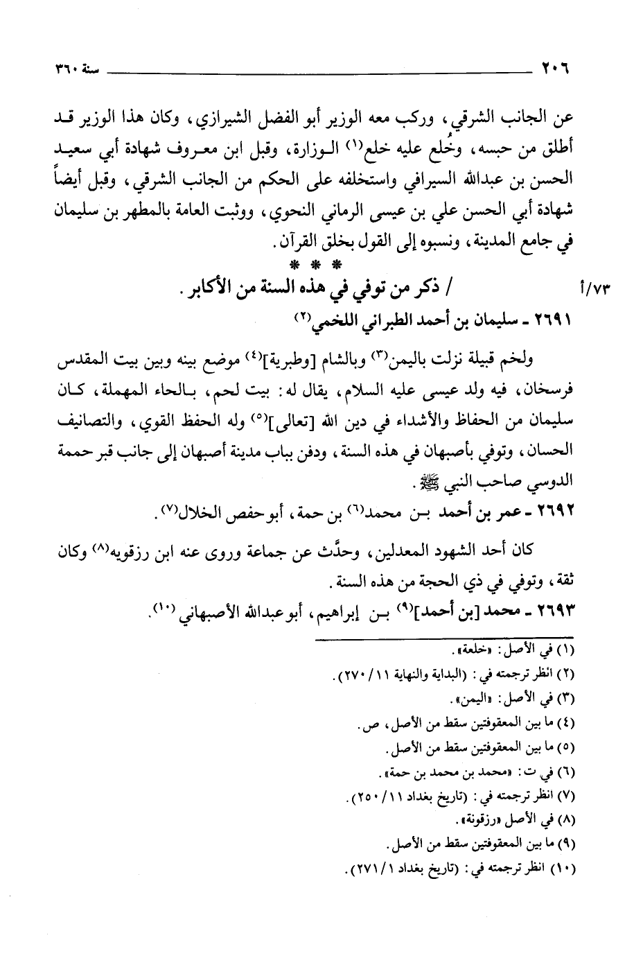 [2] ولخم قبيلة نزلت باليمن [3] وبالشام [وطبرية] [4] موضع بينه وبين بيت المقدس فرسخان، فيه ولد عيسى عليه السلام، يقال له: بيت لحم، بالحاء المهملة، كان سليمان من الحفاظ والأشداء في دين الله [تعالى] [5] وله الحفظ القوي، والتصانيف الحسان، وتوفي بأصبهان في هذه السنة، ودفن بباب مدينة أصبهان إلى جانب قبر حممة الدوسي صاحب النَّبيّ صَلَّى اللهُ عَلَيْهِ وَسَلَّمَ.