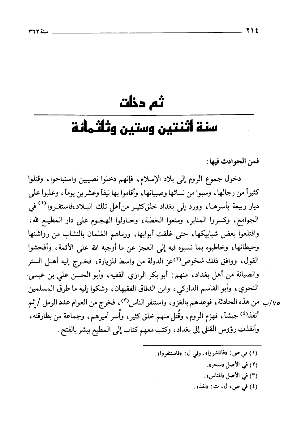 دخول جموع الروم إلى بلاد الإسلام، فإنهم دخلوا نصيبين واستباحوا، وقتلوا كثيرا من رجالها، وسبوا من نسائها وصبيانها، وأقاموا بها نيفًا وعشرين يومًا، وغلبوا على ديار ربيعة بأسرها، وورد إلى بغداد خلق كثير من أهل تلك البلاد، فاستقروا [1] في الجوامع، وكسروا المنابر، ومنعوا الخطبة، وحاولوا الهجوم على دار المطيع للَّه، واقتلعوا بعض شبابيكها، حتى غلقت أبوابها، ورماهم الغلمان بالنشاب من رواشنها وحيطانها، وخاطبوه بما نسبوه فيه إلى العجز عن ما أوجبه الله على الأئمة، وأفحشوا القول، ووافق ذلك شخوص [2] عز الدولة من واسط للزيارة، فخرج إليه أهل الستر والصيانة من أهل بغداد، منهم: أبو بكر الرازي الفقيه، وأبو الحسن علي بن عيسى النحوي، وأبو القاسم الداركي، وابن الدقاق الفقيهان، وشكوا إليه ما طرق المسلمين من هذه الحادثة، فوعدهم بالغزو، واستنفر الناس [3] ، فخرج من العوام عدد الرمل/ ثم أنفذ [4] جيشًا، فهزم الروم، وقتل منهم خلق كثير، وأسر أميرهم، وجماعة من بطارقته، وأنفذت رءوس القتلى إلى بغداد، وكتب معهم كتاب إلى المطيع يبشر بالفتح.