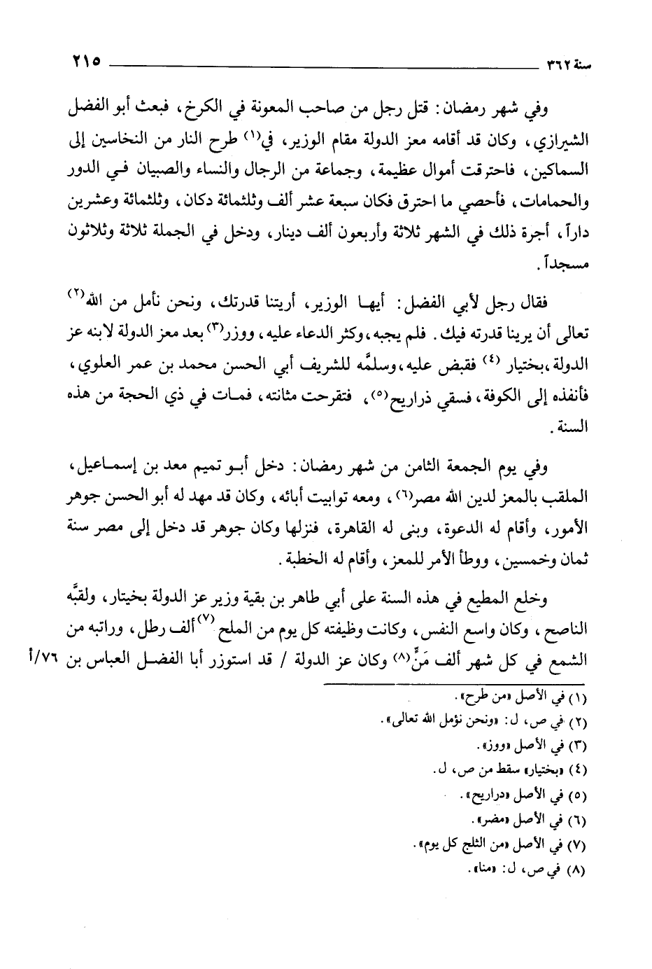 فقال رجل لأبي الفضل: أيها الوزير، أريتنا قدرتك، ونحن نأمل من الله [2] تعالى أن يرينا قدرته فيك. فلم يجبه، وكثر الدعاء عليه، ووزر [3] بعد معز الدولة لابنه عز الدولة، بختيار [4] فقبض عليه، وسلَّمه للشريف أبي الحسن محمد بن عمر العلوي، فأنفذه إلى الكوفة، فسقى ذراريح [5] ، فتقرحت مثانته، فمات في ذي الحجة من هذه السنة.