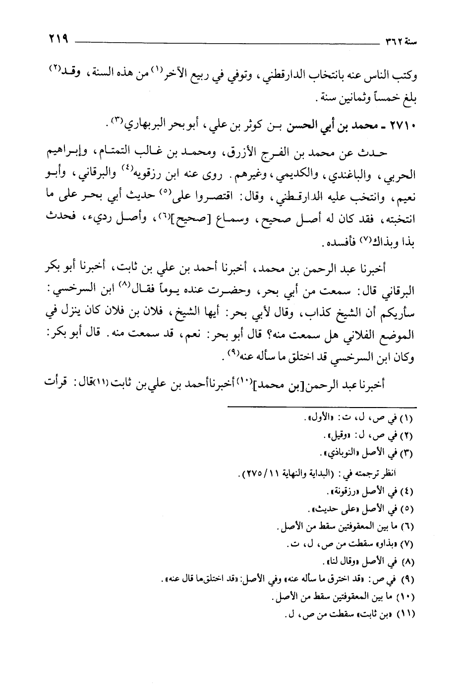 أَخْبَرَنَا عَبْدُ الرَّحْمَنِ بْنُ مُحَمَّدٍ، أَخْبَرَنَا أَحْمَدُ بْن علي بْن ثابت، أَخْبَرَنَا أَبُو بَكْر البرقاني قال: سمعت من أبي بحر، وحضرت عنده يوما فقال [8] ابن السرخسي: