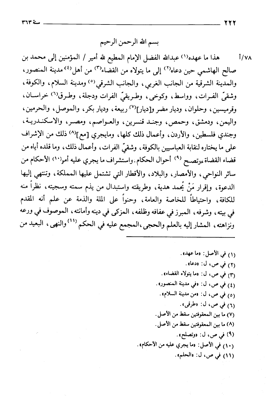 بسم الله الرحمن الرحيم هذا ما عهده [1] عبد الله الفضل الإمام المطيع للَّه أمير/ المؤمنين إلى محمد بن صالح الهاشمي حين دعاه [2] إلى ما يتولاه من القضاء [3] من أَهْل [4] مدينة المنصور، والمدينة الشرقية من الجانب الغربي، والجانب الشرقي [5] ومدينة السلام، والكوفة، وشقي الفرات، وواسط، وكوخى، وطريقي الفرات ودجلة، وطرق [6] خراسان، وقرميسين، وحلوان، وديار مضر و [ديار] [7] ربيعة، وديار بكر، والموصل، والحرمين، واليمن، ودمشق، وحمص، وجند قنسرين، والعواصم، ومصر، والإسكندرية، وجندي فلسطين، والأردن، وأعمال ذلك كلها، وما يجري [مع] [8] ذلك من الإشراف على ما يختاره لنقابة العباسيين بالكوفة، وشقي الفرات، وأعمال ذلك، وما قلده إياه من قضاء القضاة وتصح [9] أحوال الحكام واستشراف ما يجري عليه أمر [10] الأحكام من سائر النواحي، والأمصار، والبلاد، والأقطار التي تشتمل عليها المملكة، وتنتهي إليها الدعوة، وإقرار من يحمد هديه، وطريقته واستبدال من يذم سمته وسجيته، نظرا منه للكافة، واحتياطًا للخاصة والعامة، وحنوا على الملة والذمة عن علم أنه المقدم في بيته، وشرفه، المبرز في عفافه وظلفه، المزكَّى في دينه وأمانته، الموصوف في ورعه ونزاهته، المشار إليه بالعلم والحِجَى، المجمع عليه في الحكم [11] والنهى، البعيد من
